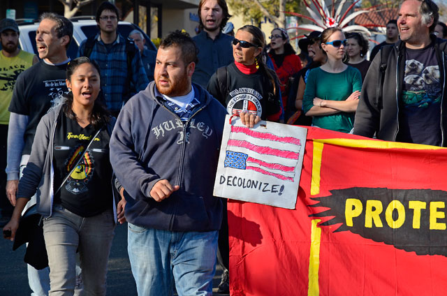 "Please show respect for our people. The 1% wants us to display violence so they can continue to send out their stromtroopers against the 99%. Please show respect for the tribal people whose lands we will be walking on today. Oh way ah, Oh way ah, let the spirit of the people bring true justice to all people and nations."