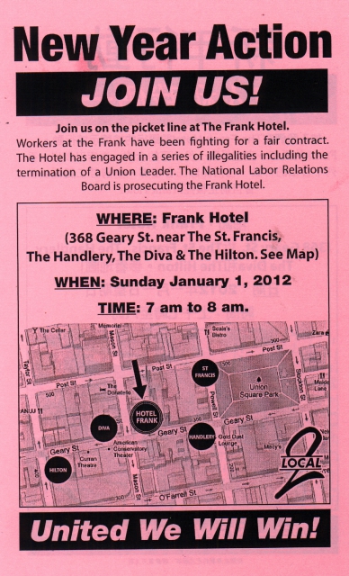 Workers at Hotel Frank have been under attack since Wells Fargo foreclosed on the hotel in May, 2010. Wells Fargo brought in a new management company, Provenance, which refuses to recognize the UNITE HERE Local 2 contract, has dangerously increased the workload for room cleaners and other workers, and has not paid anything for medical coverage or pensions.