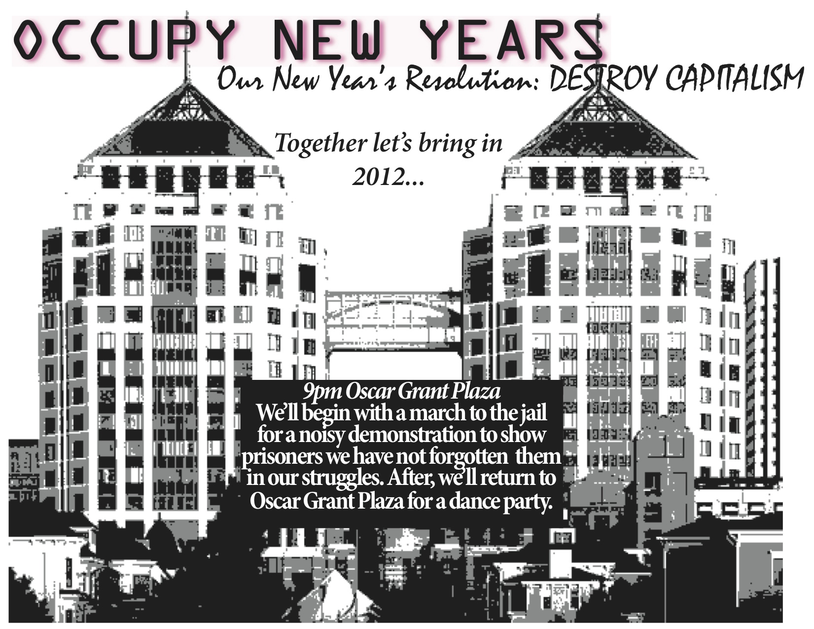 On December 31st meet at Oscar Grant Plaza at 9pm. We’ll begin with a march to the jail for a noisy demonstration to show prisoners we have not forgotten them in our struggles. Afterward, we’ll return to the Plaza for a Dance Party.