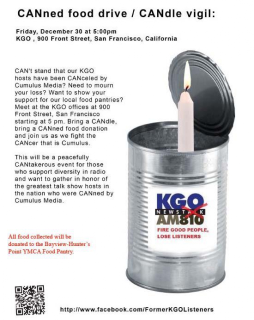 On Friday, December 30, 2011 at 5:00 pm listeners upset by the firings and format change at KGO radio will be protesting the changes at the KGO Studios. The protest will be held at 900 Front Street in San Francisco. Protesters will hold a candlelight vigil and will collect canned food donations for the Bayview-Hunter's Point YMCA Food Pantry. The food donations are being made in honor of Ray Taliaferro, legendary bay area broadcaster who was fired on December 1 along with other well known radio personalities at KGO. Mr. Taliaferro was born and raised in the Hunter's Point neighborhood and had worked at KGO radio for decades.