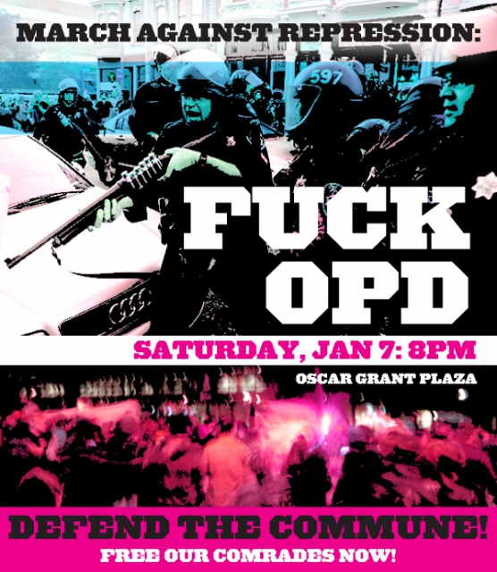 Over the past 10 days, the Oakland Police Department, under orders from leftist Mayor Jean Quan and in collusion with local business interests, has intensified its campaign of repression of Occupy Oakland. Targeted arrests, lightning-raids, surveillance, theft of belongings, planted evidence and other dirty, nasty tricks have been increasingly employed. All in an effort to supress the ongoing activity of OO and to send a message ahead of January 28th's scheduled building appropriation and February's mass feminist action. OPD's recent dirty war is, of course, just another act in the long theatre of strategic suppression and intimidation of radical political movement in Oakland by a police force notorious for its nefariously-brutal tactics.