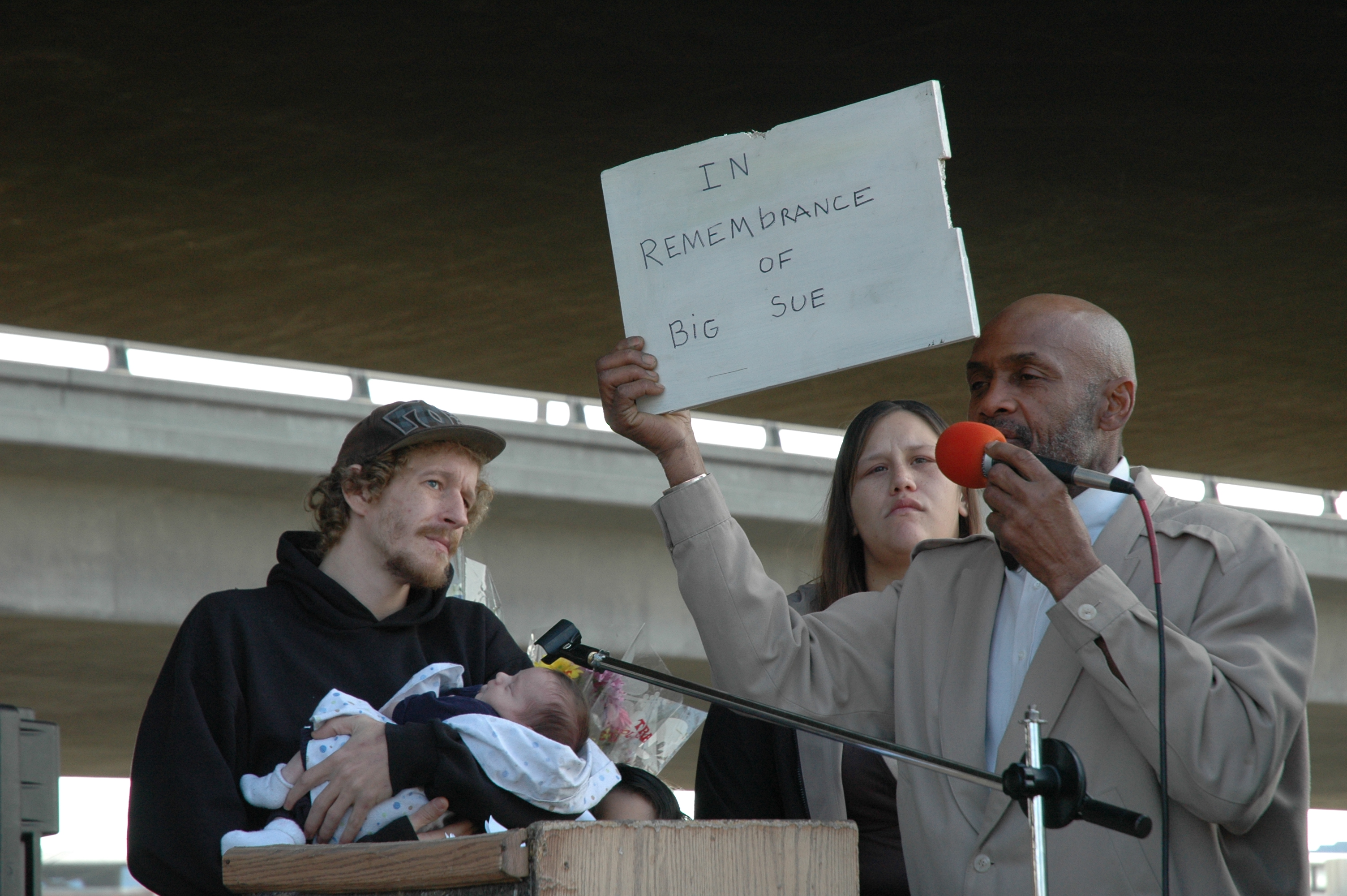 Big Sue, who was a homeless advocate and homeless herself, was given a funeral today that started at the place of her death, outside the gate of the Poverello House (a homeless center in Fresno). About 100 homeless people, family members, and friends followed the hearse to Broadway and San Benito where services were held at a homeless ministry run by Ray Polk, who is also homeless. Photo below: Minister Ray Polk with Big Sue’s daughter Suzzanne. The baby is Big Sue’s grandson.