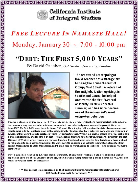 The Social and Cultural Anthropology Department and CIIS Public Programs present a lecture by David Graeber: "Debt: The First 5,00 Years".