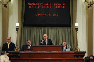 Photo of Brown delivering State of the State Address courtesy of the Governor's Office.
