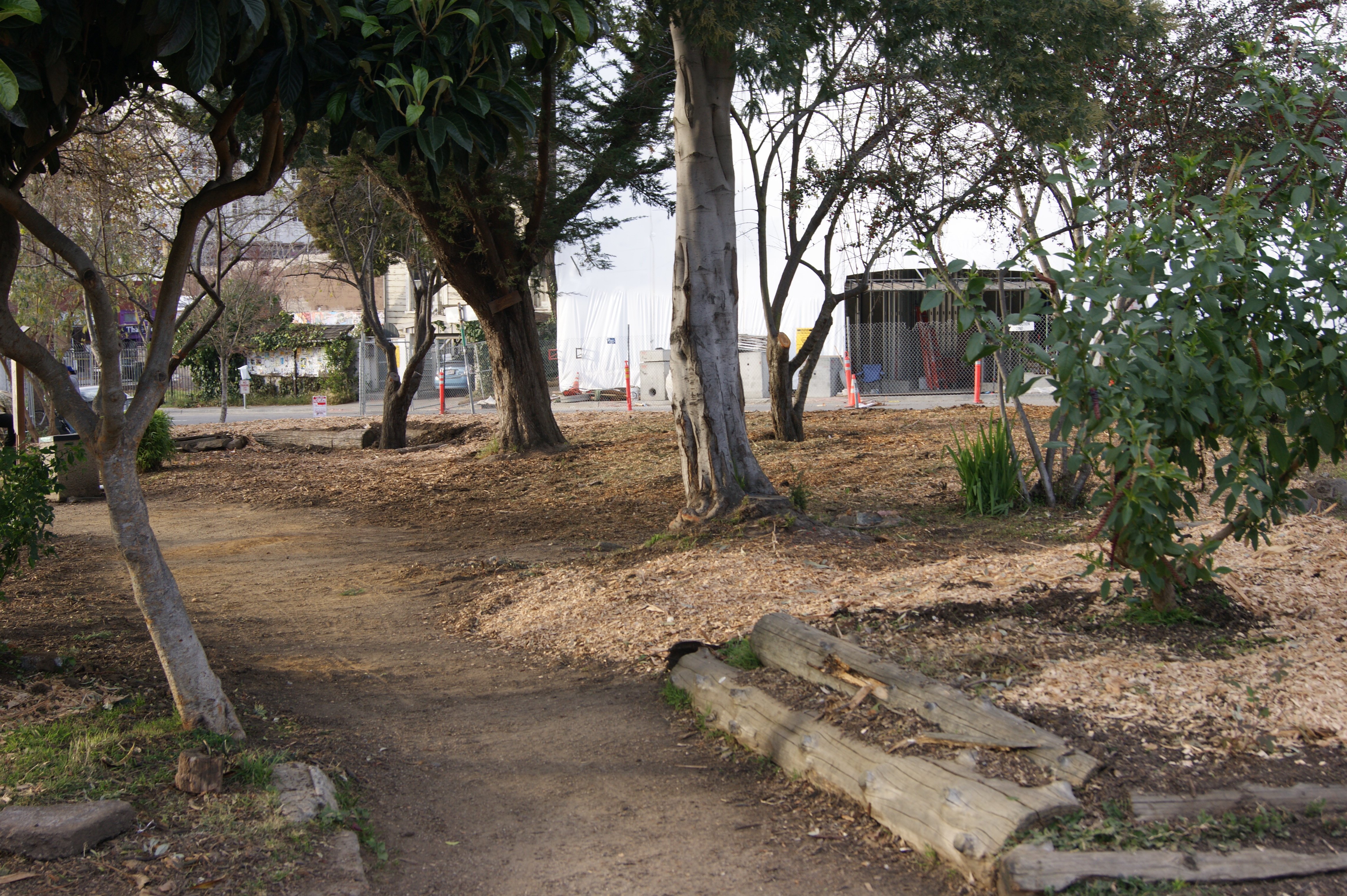 Berkeley Police and contracted landscape workers hired by UCB started setting up orange plastic fencing around the west end of People’s Park. By 2pm the damage had been done: Bulldozers, backhoes, and bobcats… chainsaws and chippers… the berms of pavement lifted by activists in 1979 and stacked next to both the Dwight and Haste sidewalks as a reminder of our history were leveled. Dozens of mature plants tended by community gardeners were turned to mulch, long-existing pathways were indiscriminately blocked off with no consideration for handicapped access. Perhaps worst of all was the indiscriminate vandalism of a volunteer-built structure that existed along the fence line on the west side, starting near the NW corner and running southwards about 72 ft. This structure, called a “pergola”, was built by volunteers in 1999 and 2000 out of the old-growth redwood lumber that had been recycled from the University’s ill-fated volleyball courts. The University required an incredibly involved and drawn out approval process for the pergola structure that took almost a year to accomplish. Both the City of Berkeley Planning Department and the University of California’s Landscape Architect, Jim Horner, signed off on the project. The structure was inspected after it was completed