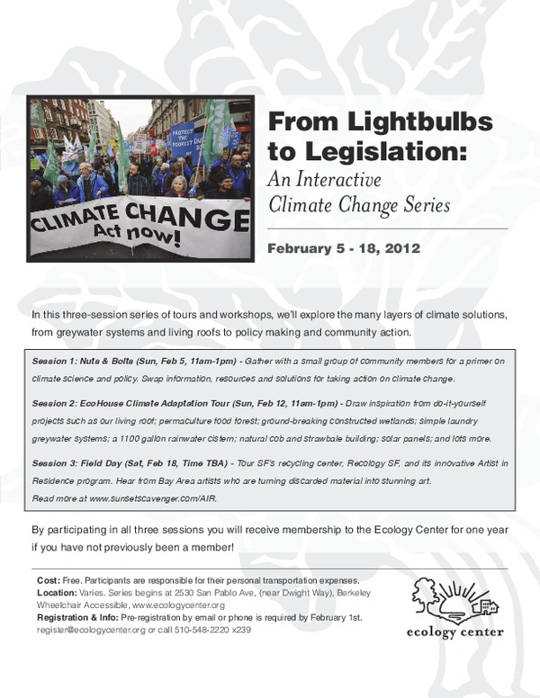 When it comes to climate change, switching out lightbulbs is only part of the solution. In this three-session series of tours and workshops, we'll explore the many layers of climate solutions, from greywater systems and living roofs to policy making. All are welcome to sign up and those who have attended previous Ecology Center climate workshops are also encouraged to participate in this new series.
