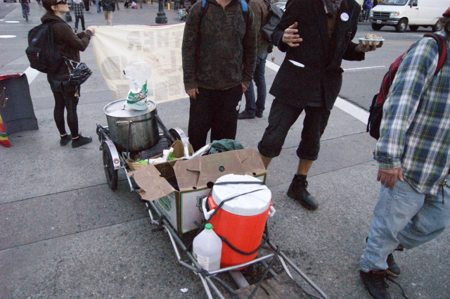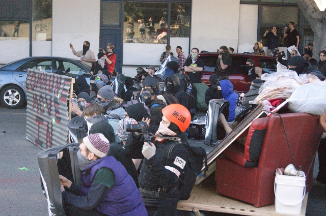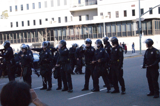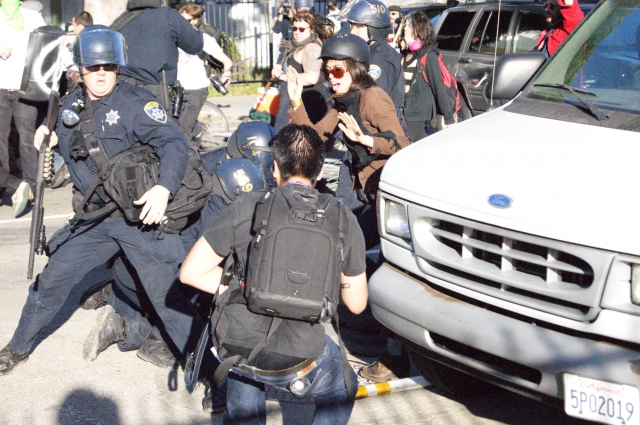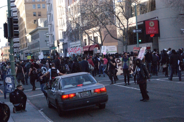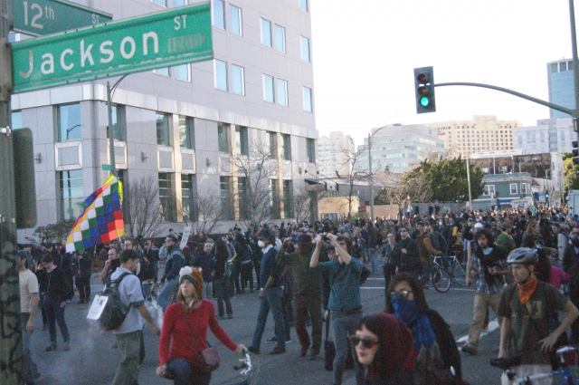 All of this occurred during the day, but it was that street battle that set the tone for the police response later in the evening. After taking a break in Oscar Grant Plaza, feeding everyone and resting, the group headed out for their evening march. Around 5pm, the group took to the street at 14th and Broadway and began a First-amendment sanctioned march around the city. The police response was very aggressive.