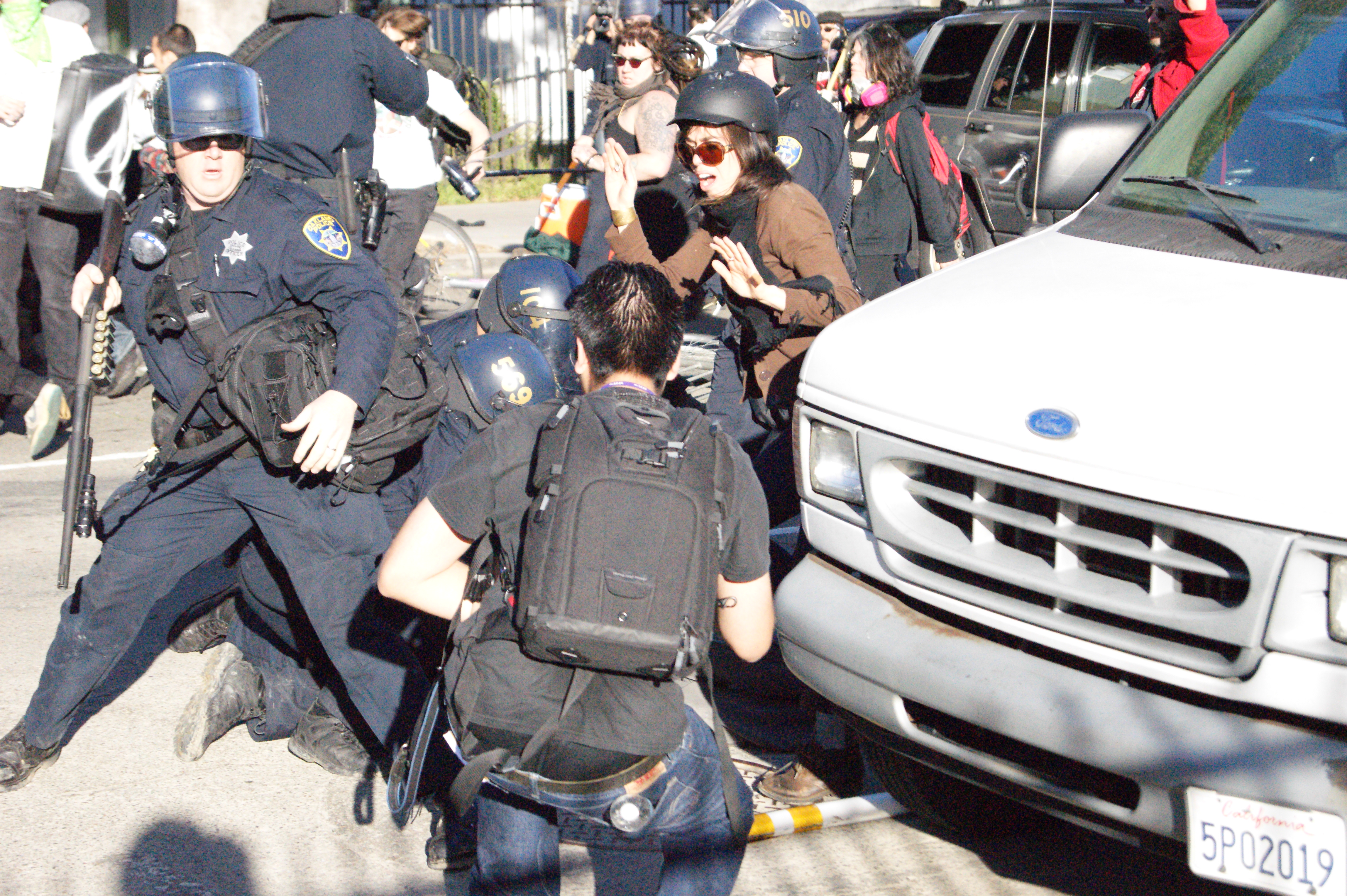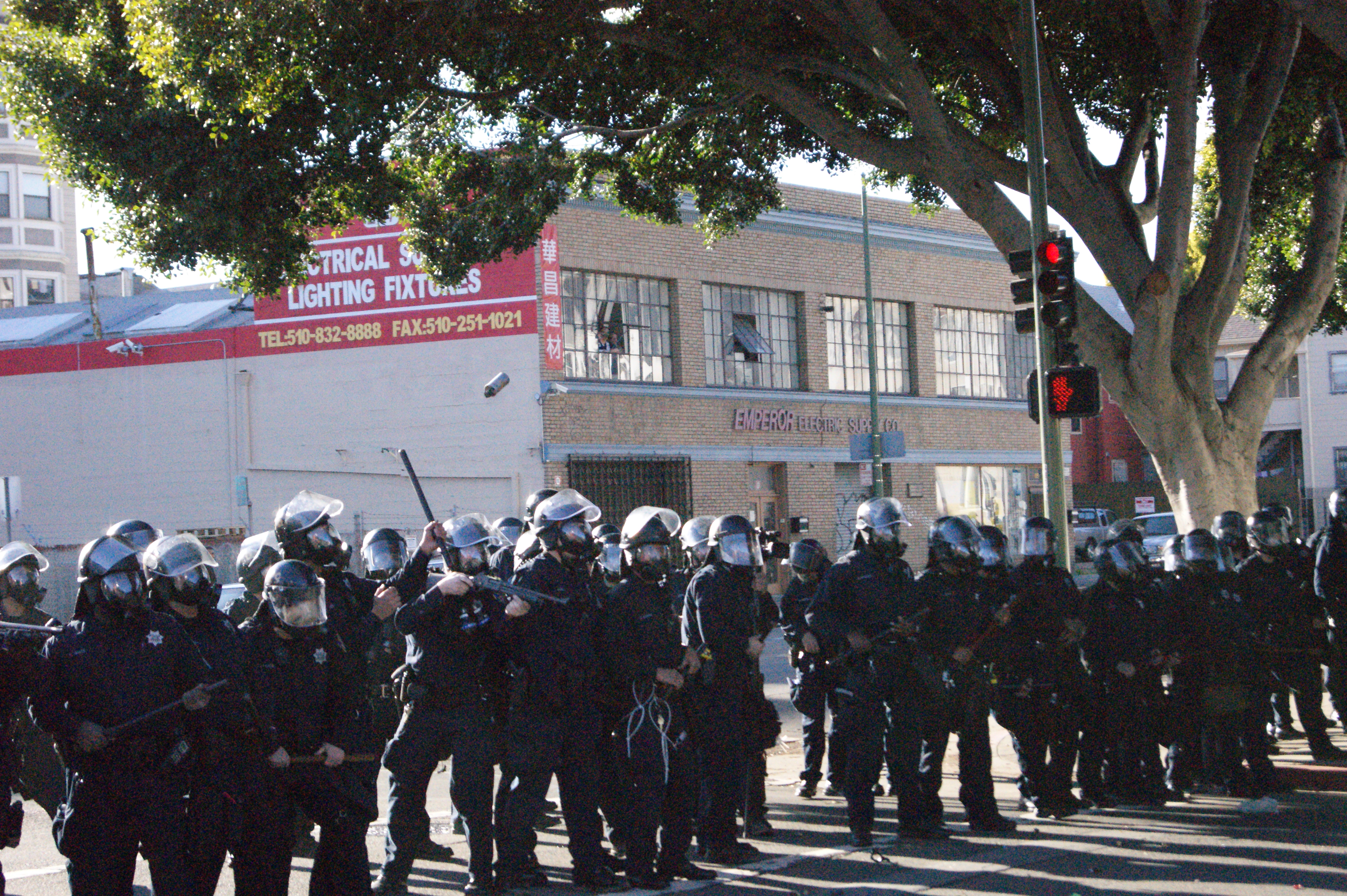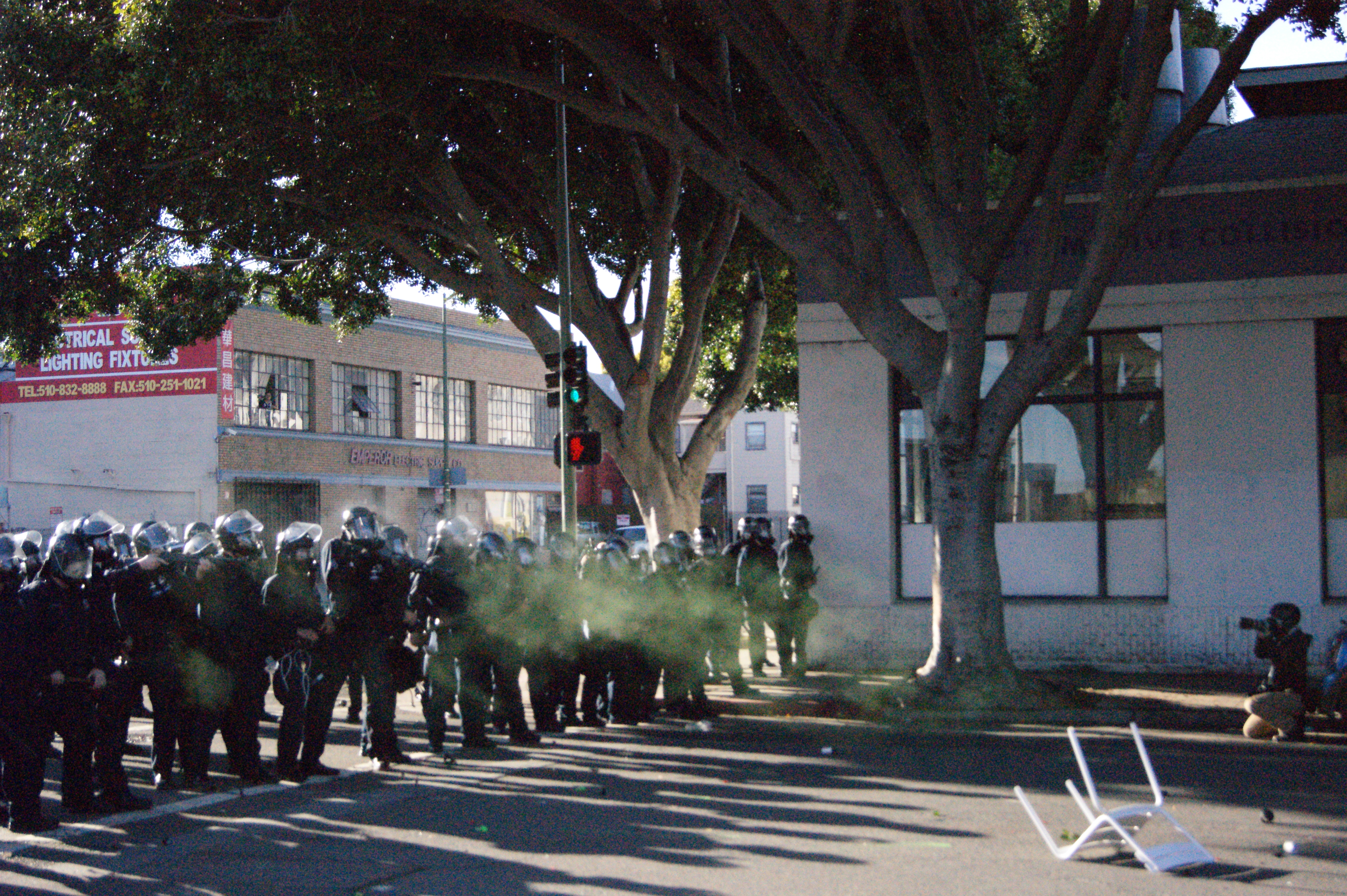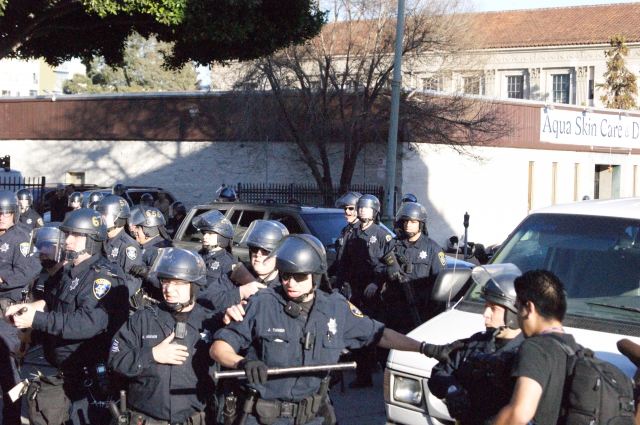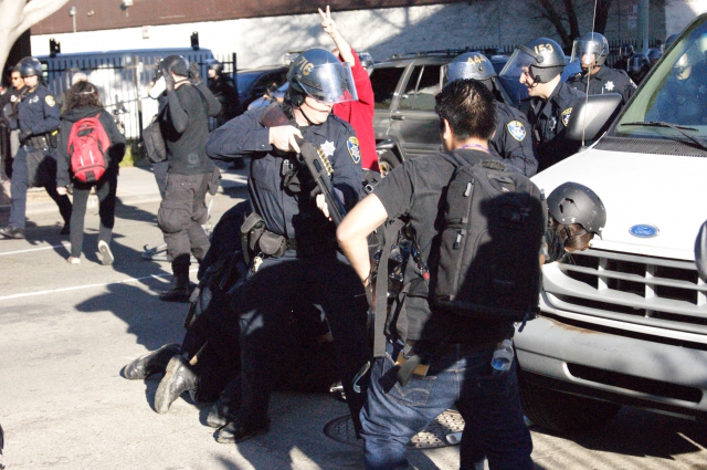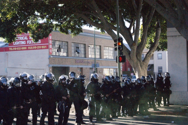 After the police fired heavily on the protesters, they pushed their line forward and made a few arrests. The protesters regrouped down the block and began to march the other way (followed by police), back to Oscar Grant Plaza.