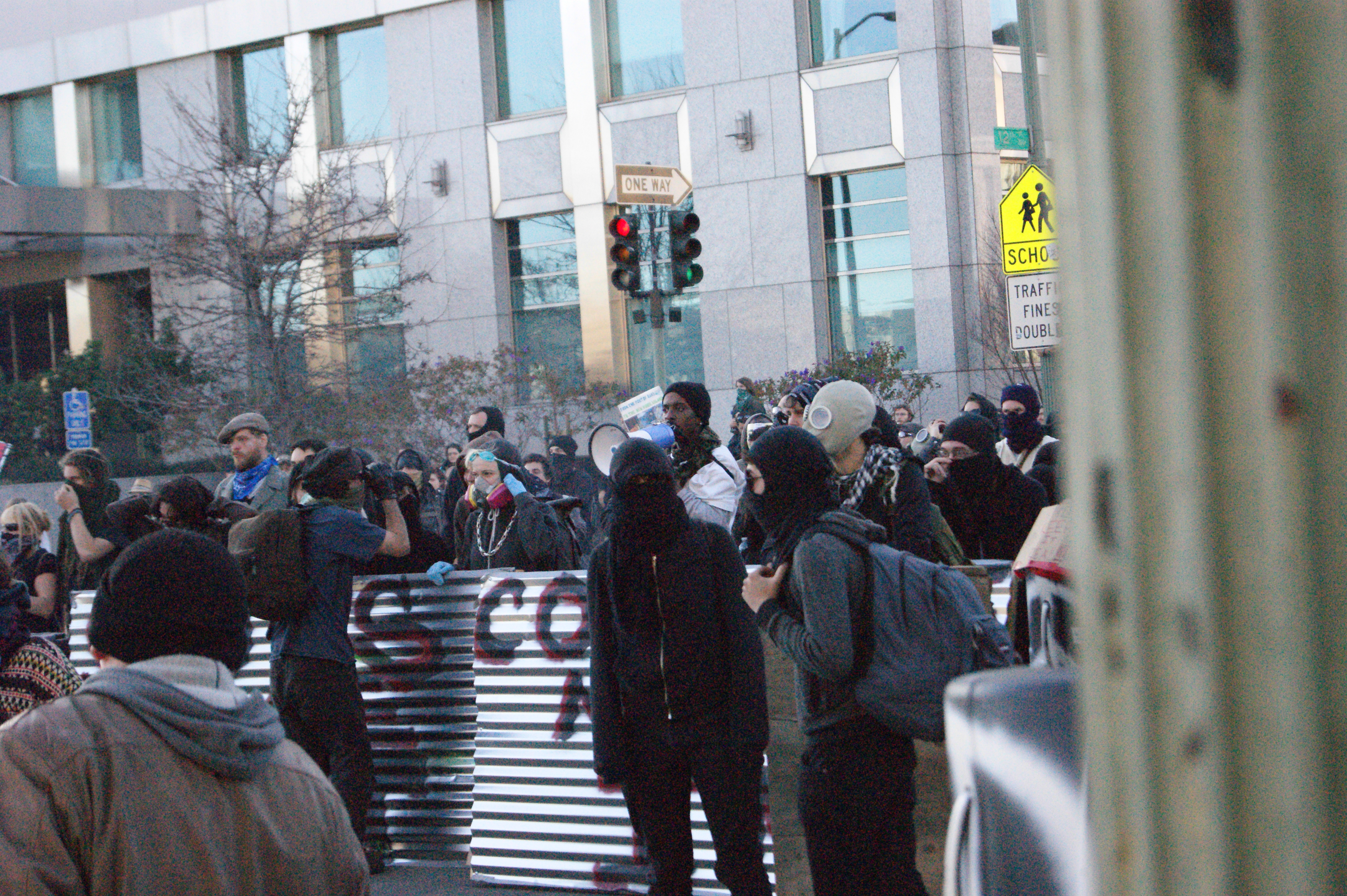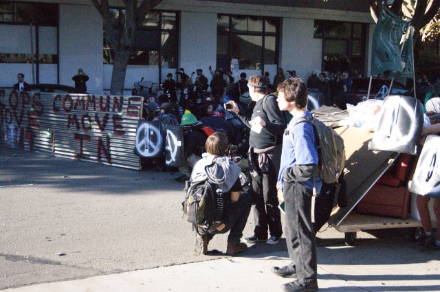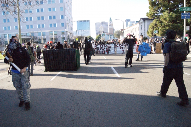 The stated goal for the day was to "move-in" to a large, abandoned, building to turn it into a social and political center. It is a long vacant convention center - the only people ever near there are the homeless who use the space outside the building as a bed. The building occupation also draws attention to the large number of abandoned and unused buildings in Oakland. The day started with a rally and a march to the proposed building. The police knew which building was the target, surrounded it, and used highly mobile units to try and divert the protest. After avoiding police lines, the group made it to one side of the building. Now, this is a very large building, and we were on a road with construction fences on both sides, and a large ditch separating us from the cops. The police fired smoke grenades into the crowd as the group neared a small path around the ditch, towards the building. They declared an unlawful assembly, and this is when the crowd broke down the construction fence. A few people broke fences to escape the situation, others because they were pissed. A couple more fences were taken down then necessary, but no valuable equipment was destroyed. They only things broken were fences.