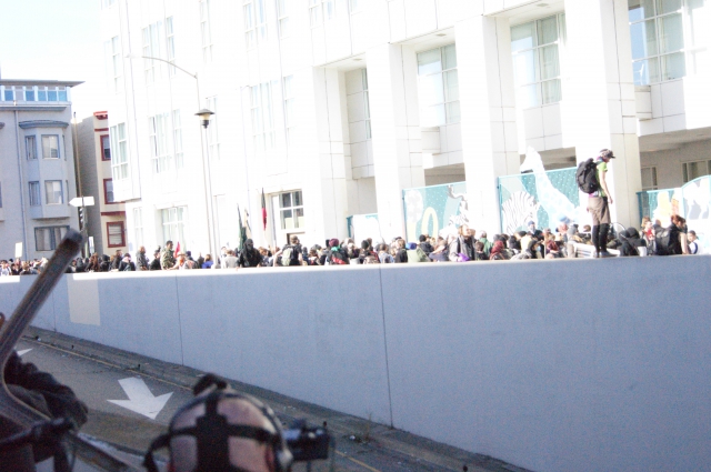 Outside the police lines, things were still happening. A group that escaped the trap decided to head back to Oscar Grant Plaza. I do not know how, but they opened the front door to city hall and occupied the building. Opened, as in no window smashing. The move was not meant to be an occupation but more of a show of solidarity to the 300 arrested protesters down the street. When all the people being arrested heard the news, they let out a big cheer...