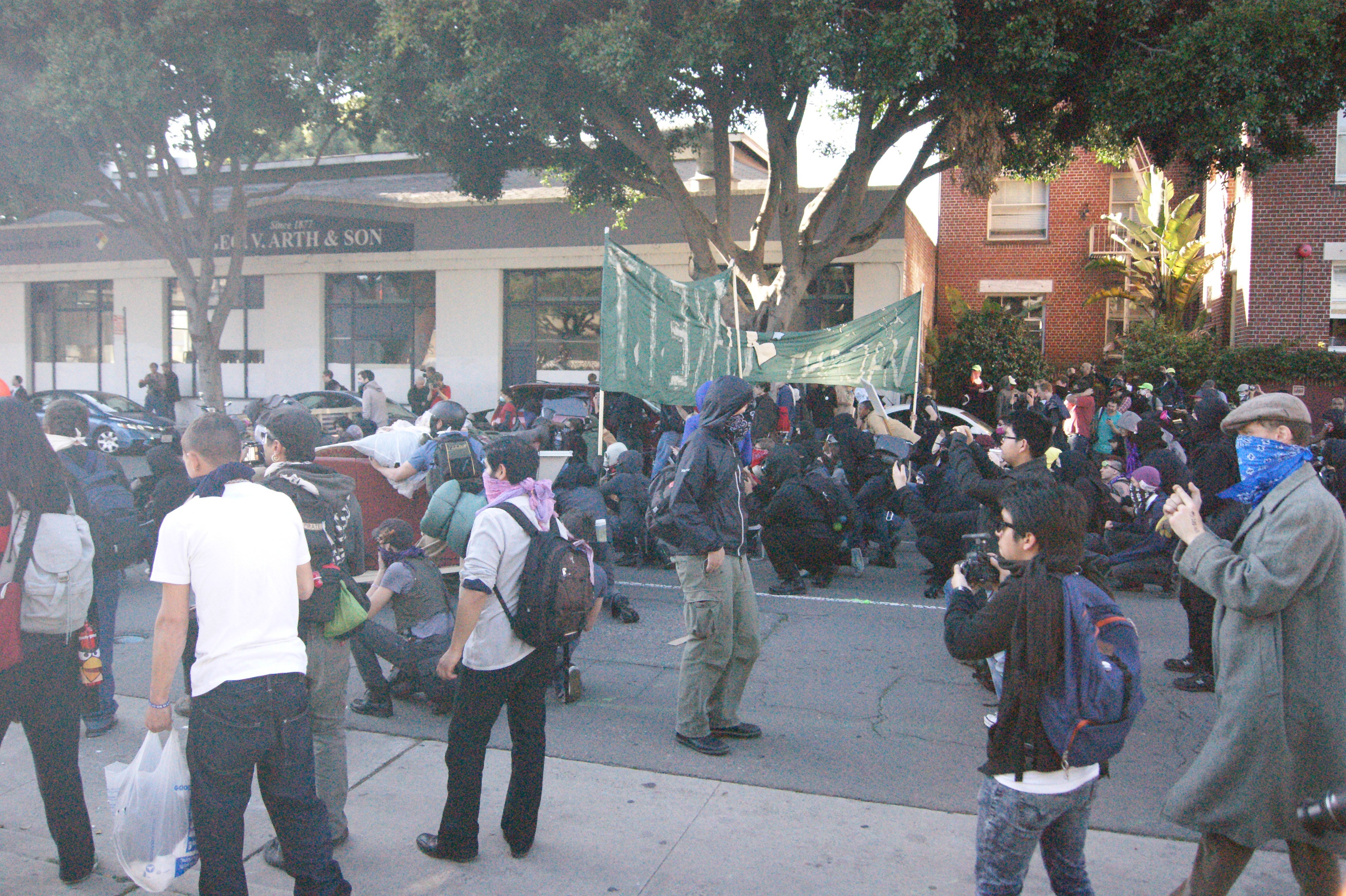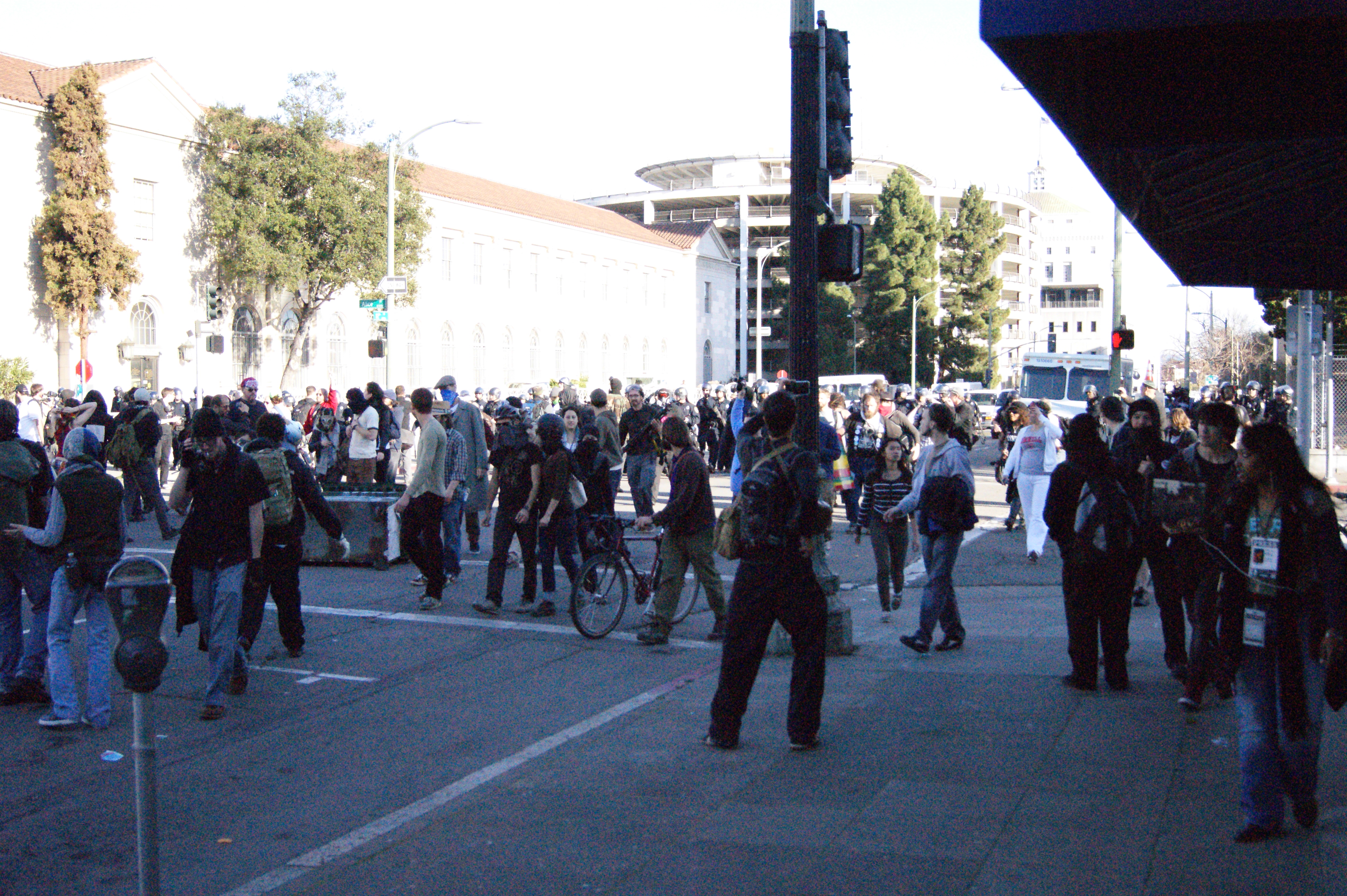 The second, and successful, kettle occurred as the protest was headed back up Broadway, at Broadway and 24th. Again, the police appeared quickly in front of the crowd, as well as a line behind the crowd. This time there was no side street. A few people attempted to escape into the YMCA; some mis-infonformed news reports claim that the YMCA got 'occupied'. Around 300 people were trapped, mostly young people. At this point I had fallen behind the line of riot police in back of the crowd, and when the kettle was sprung I was on the other side of the police line. I have a policy of avoiding arrest, but I feel like I've been striped of some dignity. I've seen some shit go down in oaktown, but I've always avoided arrest because it was easy. Most mass arrests occur when people choose to break the law (like occupying Bank of America in downtown SF and pitching a tent to send a statement to UC Regent Monica Lozano on BofA's board - respect). At 'unlawfully assemblies', people are usually extracted by a quick attack of 5+ cops, and their often 'targets' (previously-identified and profiled protesters). If the crowd is too large, they use tear-gas.