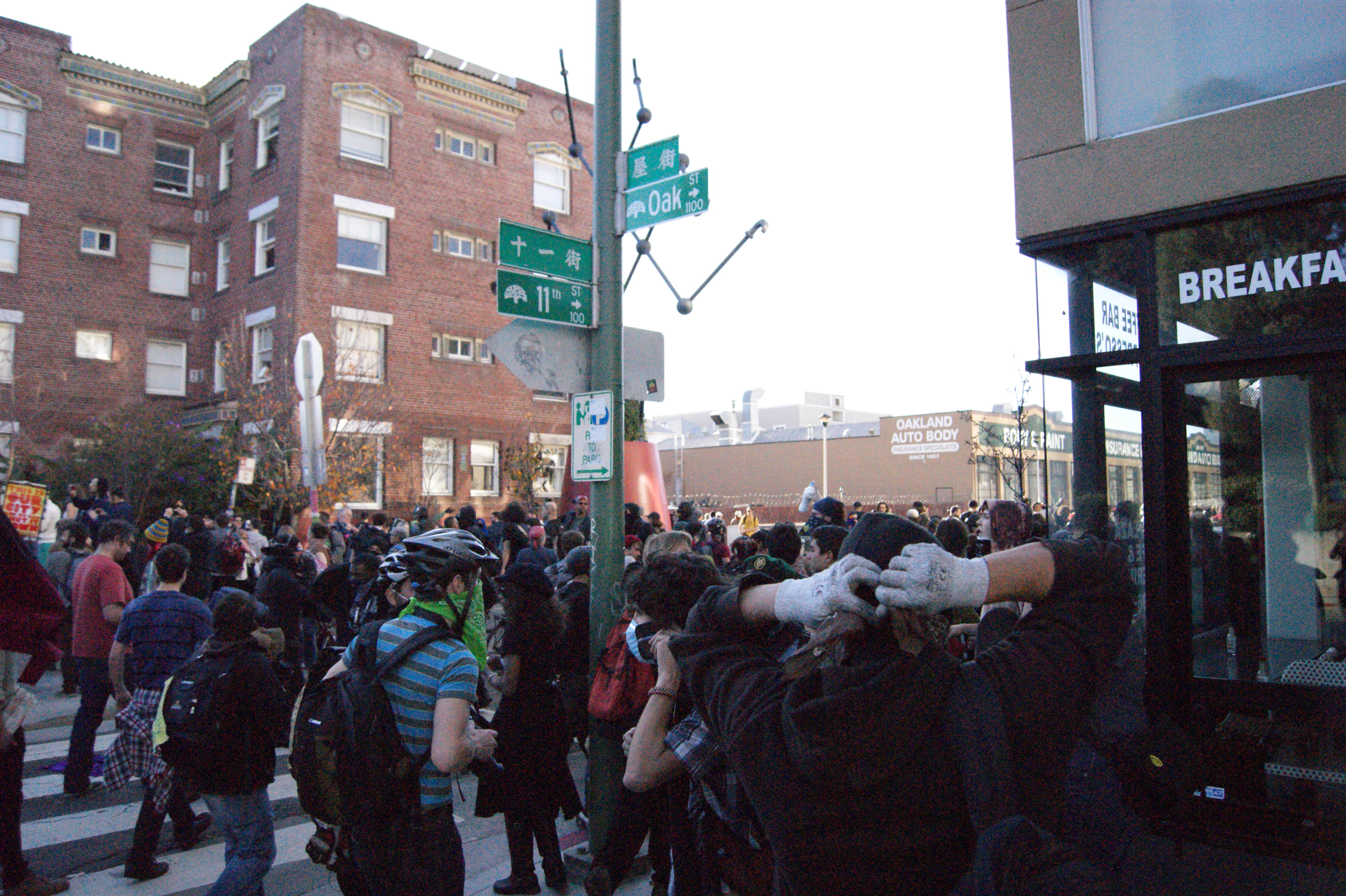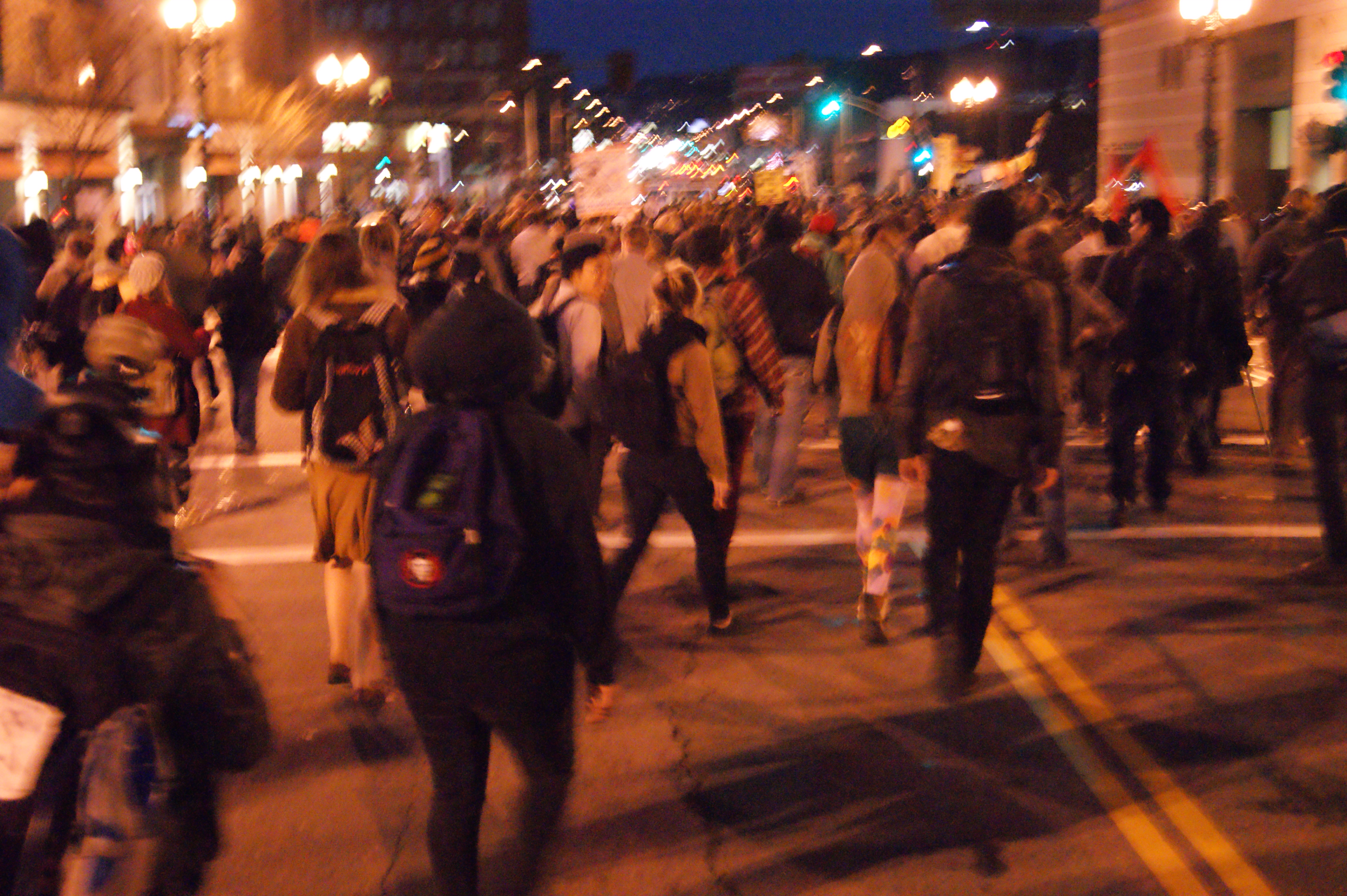 At this point, I was on edge because I knew the police were not fucking around tonight. Because of the incident earlier in the day, I realized they were effectively treating the peaceful march as a riot. There was not rioting, or intentions to riot, just dancing, optimism, hope, and walking. But clearly the police thought differently, and I knew they would try to trap us again without warning. From the moment I saw riot police running towards are march from both directions, I knew the constitution would not apply in Oakland tonight. The police made that very clear. My friends thought differently, thinking that they would not be arrested for marching. They are currently in jail.