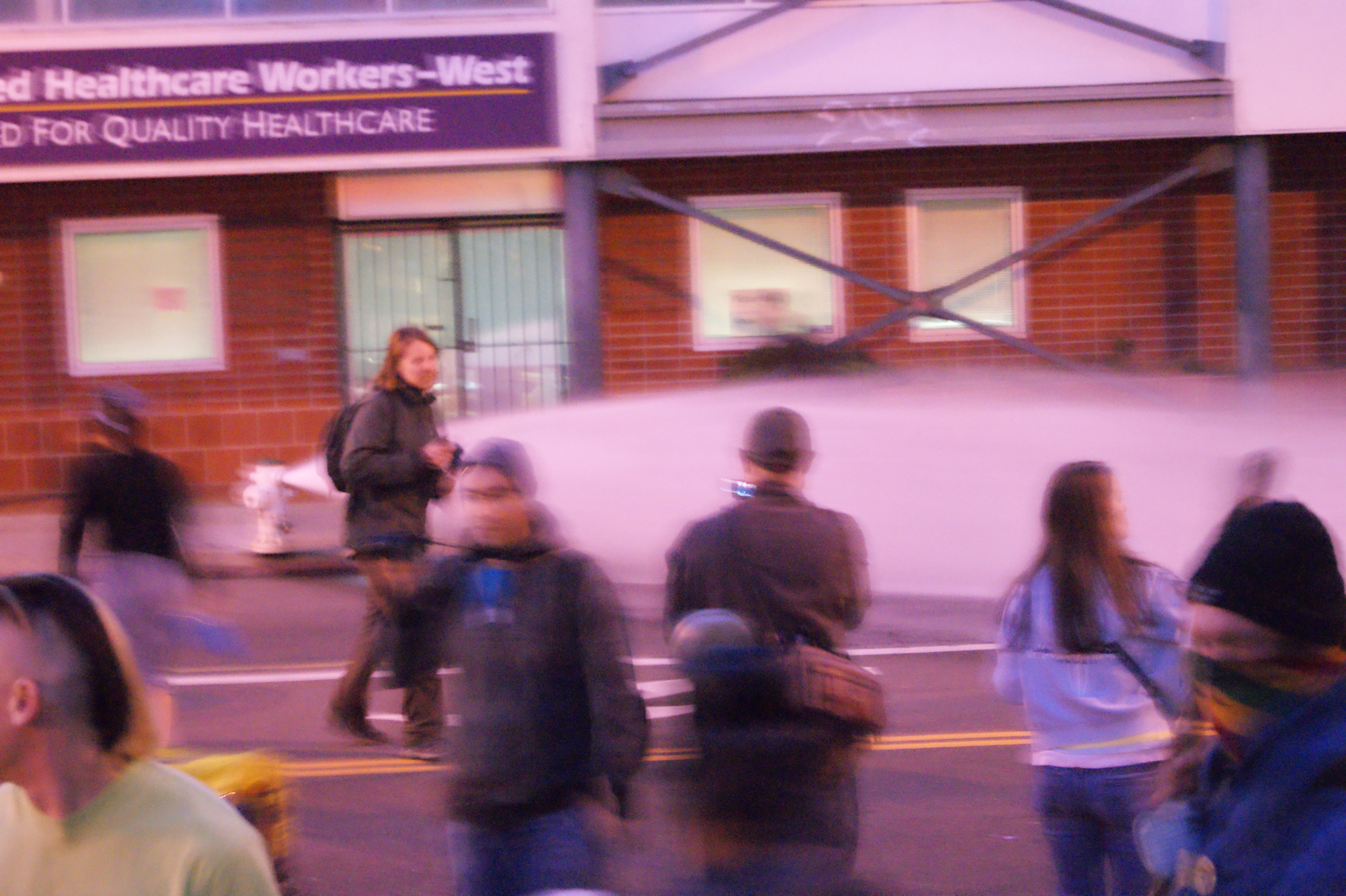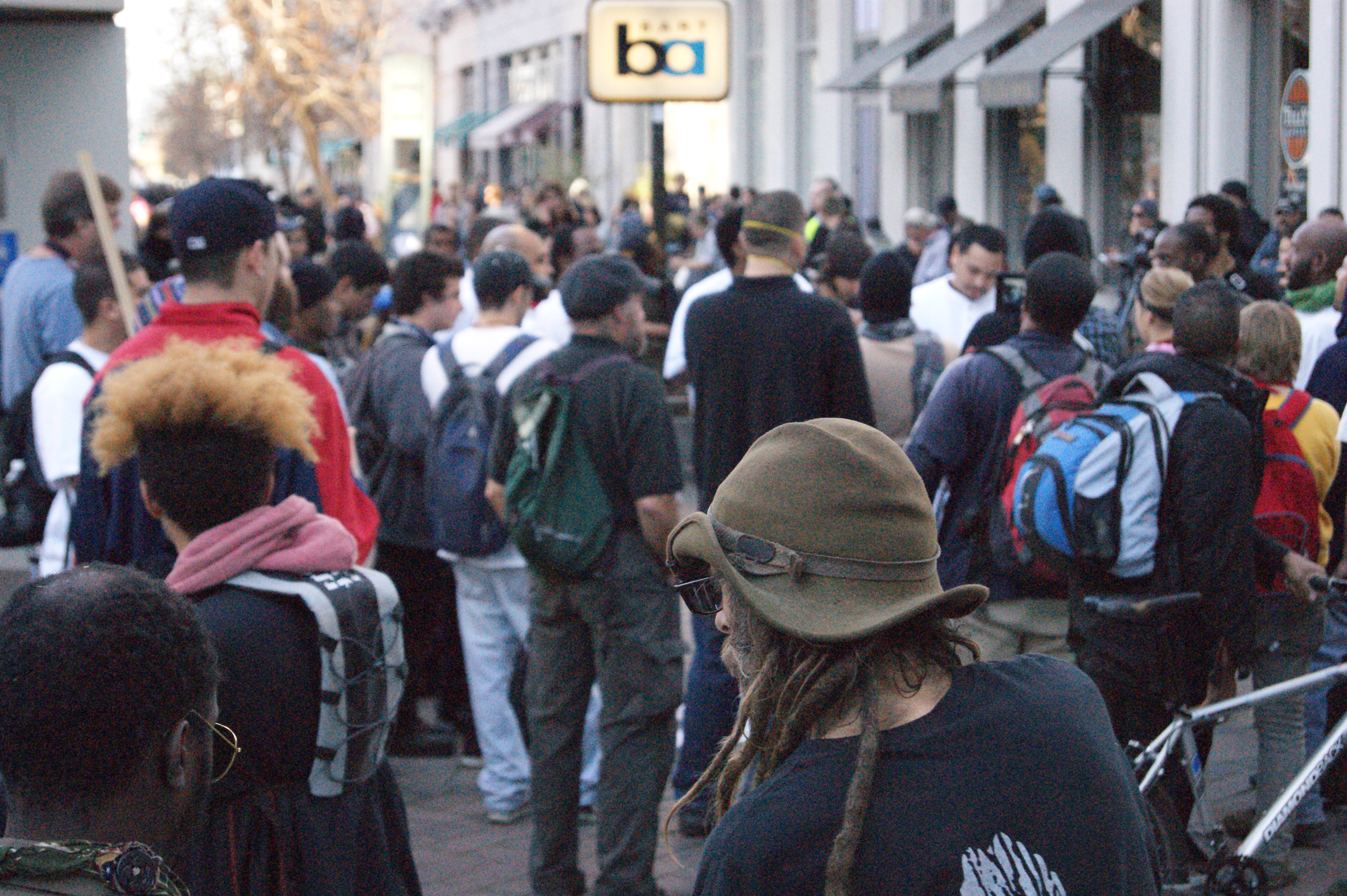 I walked back down to the 300 arrests in progress to try and get some information or spot my friends, but all I could do was wait and watch from behind the police line. My phone died. Not much happened, a lot of waiting and talking with people who also had friends on the other side. People included one French women who talked about how in France this would never be tolerated, and a teacher of one of Oakland's 10 schools being closed who was out on his birthday 'for the kids'. Eventually, I decided I needed to charge my phone, get on the internet, and figure out where and when my friends will be released. Siting down on BART was great after a long day of walking.