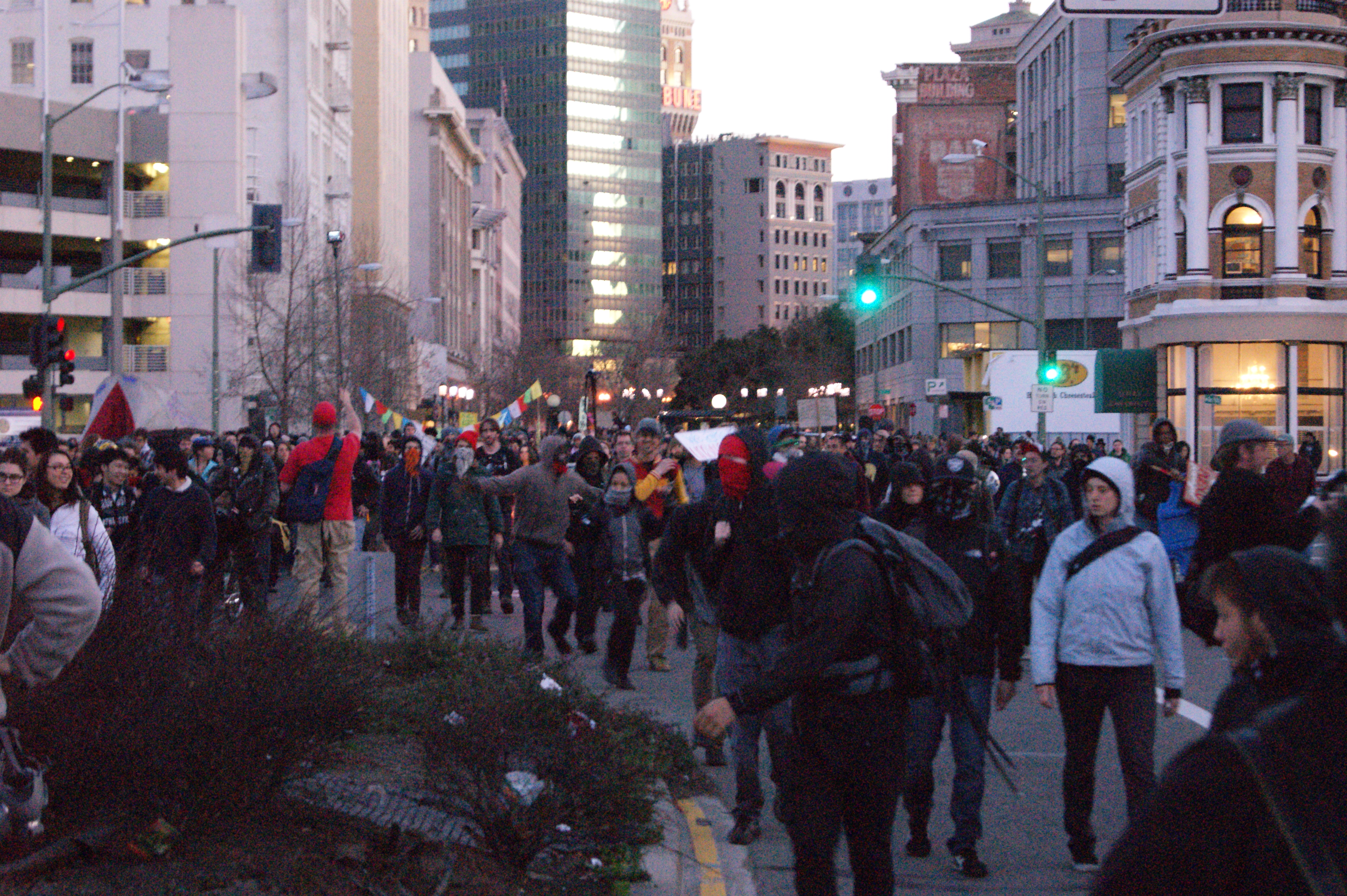 One thing to note is the police arrested to wrong part of the protest. Most people arrested were young peaceful types. Aggressive protesters, and anyone with a record, are usually very good at avoiding arrest. Point being, back at the plaza opportunists began their work. I saw some young 'jugalos' spray-painting a wall with "jugalos for life" shit and then take photos next to it. They were just young and stupid kids; some good protesters cleaned it up later in the night. Some CBS and FOX news crews forced to leave the scene, with people spanking their van. They had already gotten the footage of someone burning an American Flag in front of city hall, so their work was done. The crowd was angry about what happened, and milling around the plaza and downtown area. At one point, the first of the 9 busloads of protesters drove past 14th and Broadway. People cheered for the ones inside, and chased it down, slamming on the sides of the bus. None of the other buses came past the plaza. There is about 30 police in the immediate area, 20 in front of city hall and 10 near 14th and broadway. Clearly they were stretched thin, and did not expect the city hall incident. Mutual aid been called it; I saw cops from Oakland, Alameda County Sheriff, Pleasanton, and Berkeley.