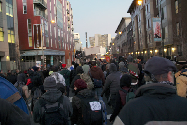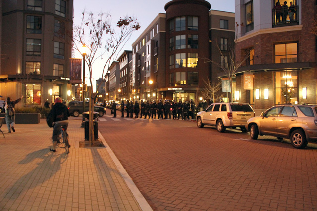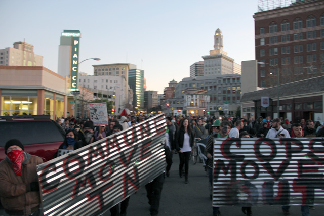 After an hour respite from police attacks on Move-In Day, hundreds of marchers headed northward out of Oscar Grant Plaza up San Pablo Avenue, presumably to reclaim an alternate vacant building for use as a community center for Occupy Oakland. Within fifteen minutes, Oakland police began to challenge marchers by forming lines across downtown streets blocking the path of the march.