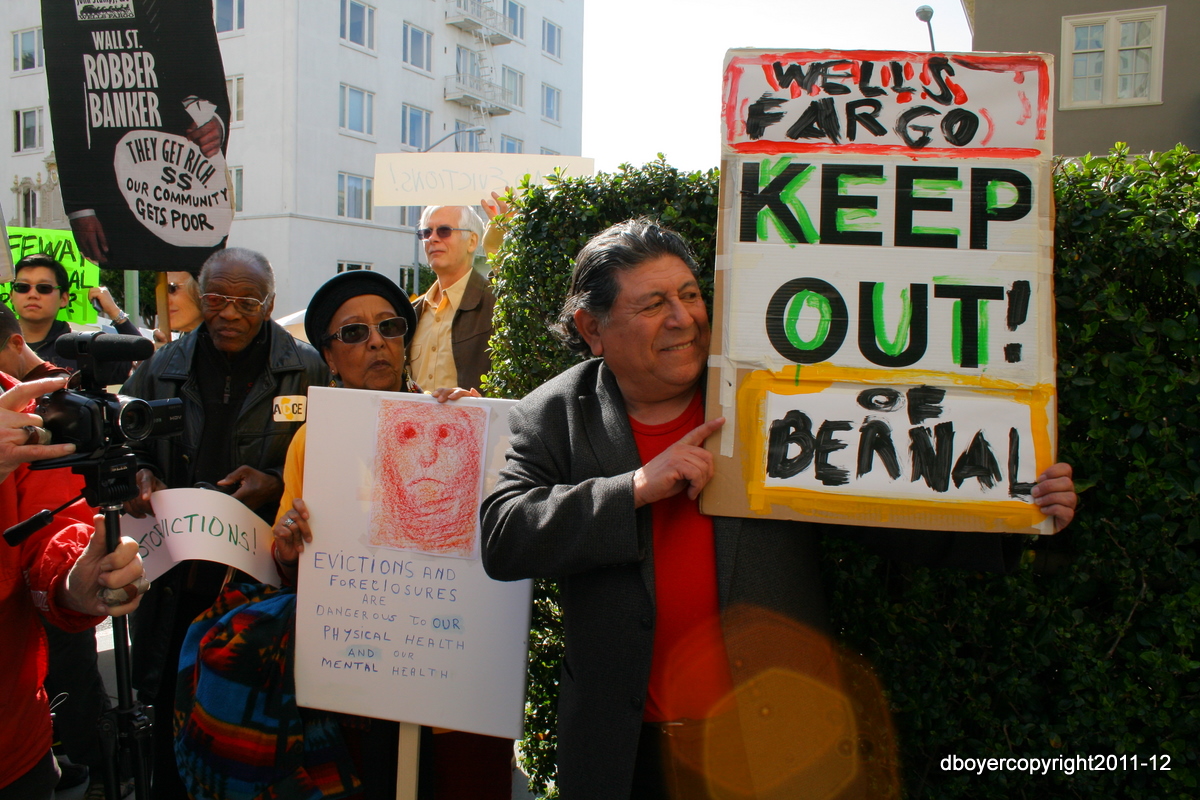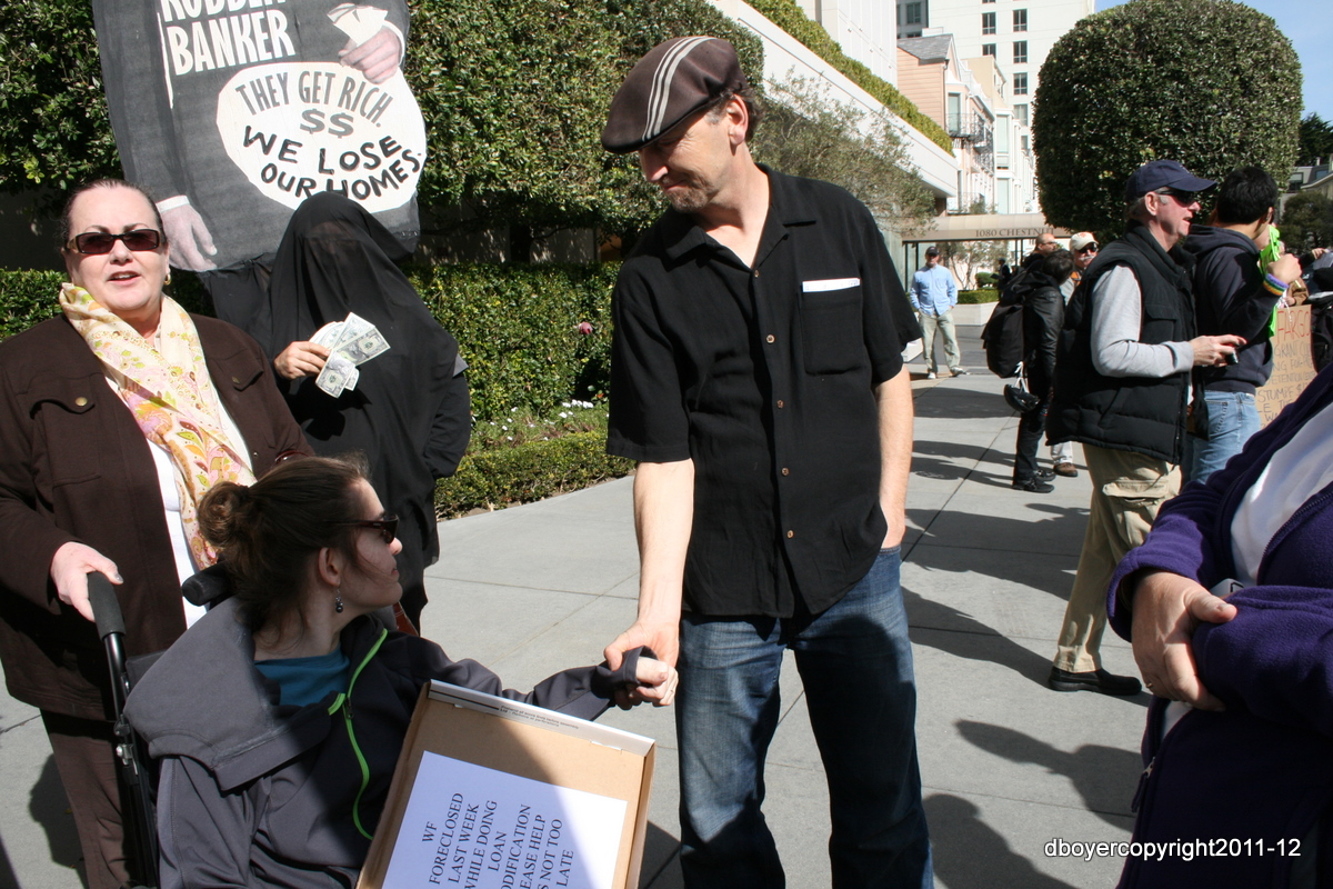 Occupy Housing hosted this event, and their demands are NO MORE FORECLOSURES AND EVICTIONS FOR PROFITS. More information can be found here, http://occupysf.org/