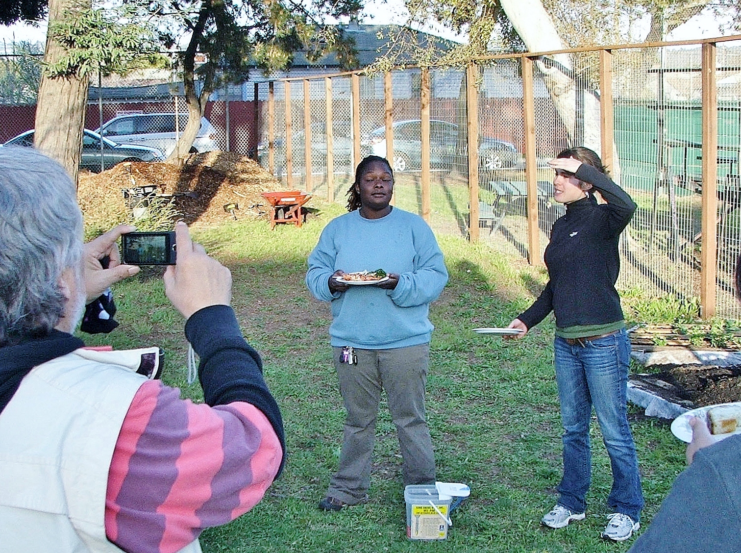OAKLAND – It was a busy late afternoon and evening at the Tassafaronga Youth Urban Farm & Community Garden, on February 27. One of many local sites for activities for Occupy Our Food Supply day, [ http://ran.org/occupy-our-food-supply ], a global day action initiated by the Rainforest Action Network, the garden hosted a work party; the sharing of a nutritious meal, much of which was made on site using greens from the garden and other locally sourced foods; a history of, and progress report on, the garden; and information sharing, networking, children playing, and general schmoozing.