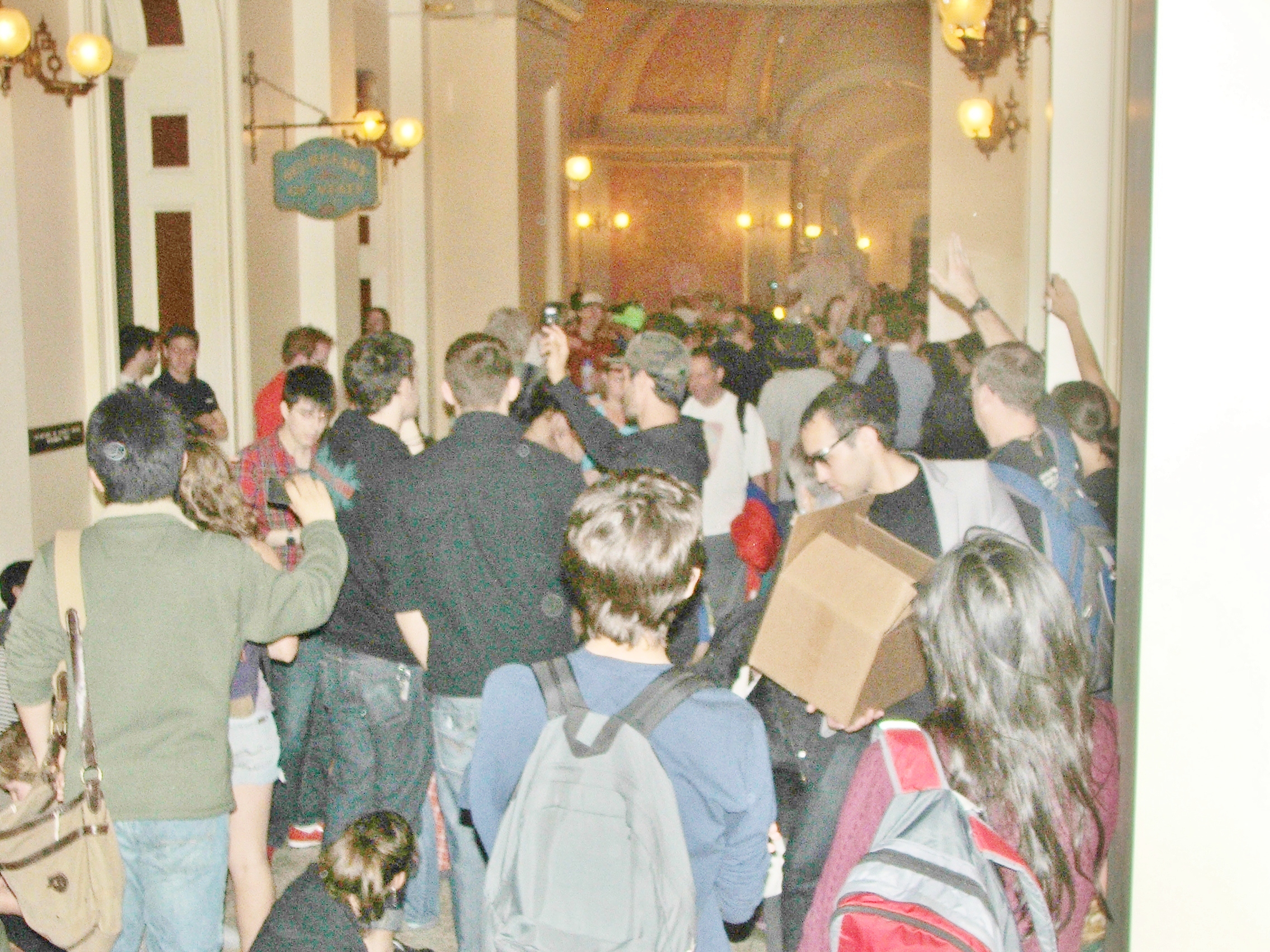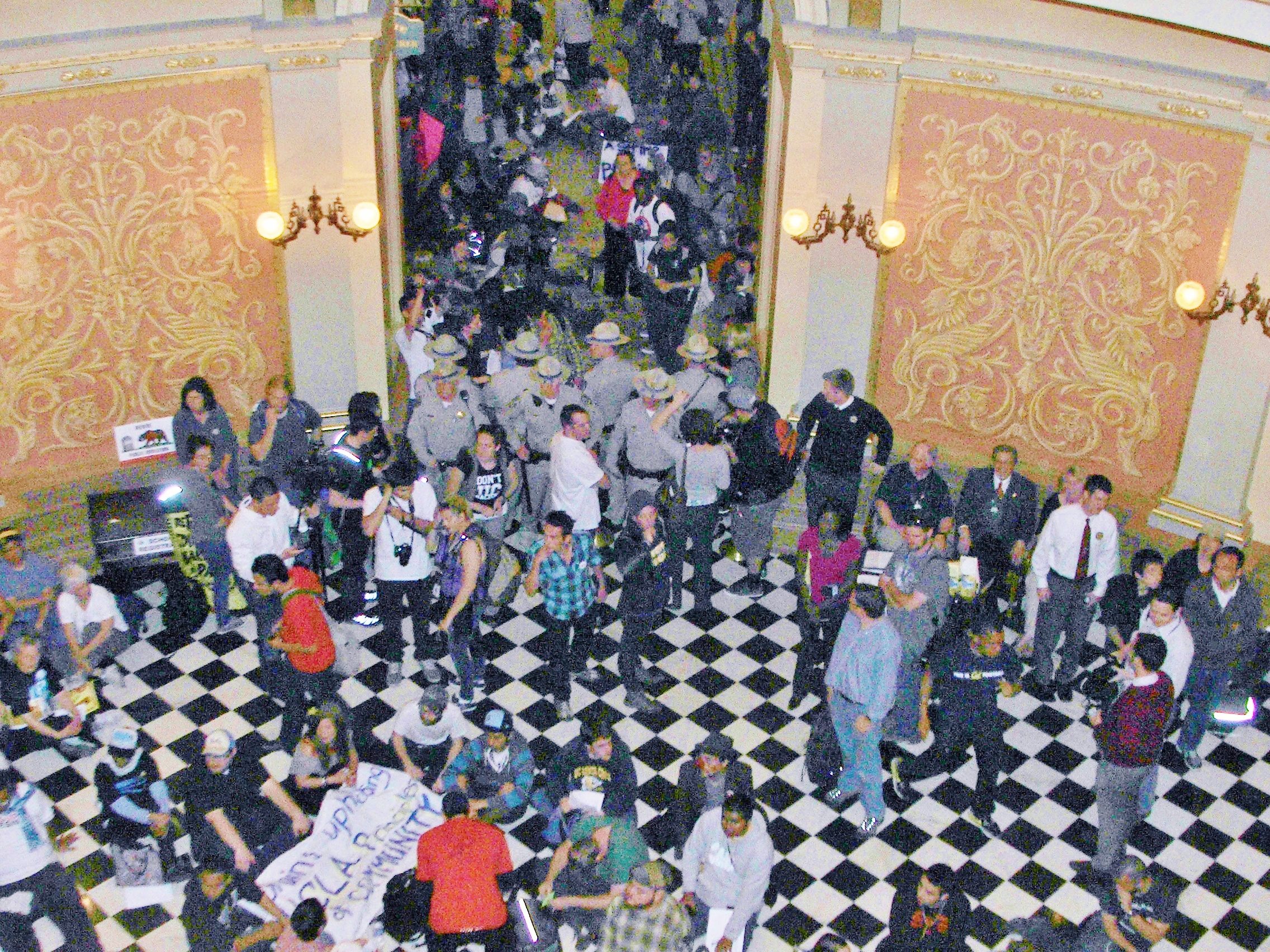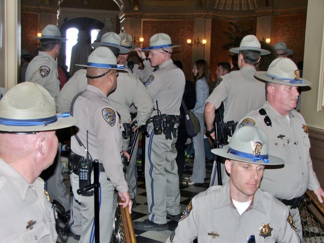 Some protesters were able to enter the Capitol Rotunda, but the California Highway Police (CHP), which is in charge of the Capitol, soon blocked off all the entrances to the Rotunda. Most protesters were jammed into the various all hallways leading into the Rotunda.