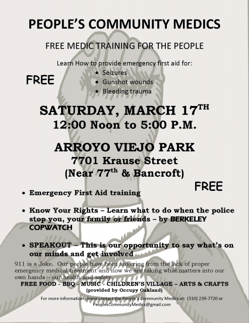 For more information call the People's Community Medics at: 510-239-7720 or PeoplesCommunityMedics [at] gmail.com