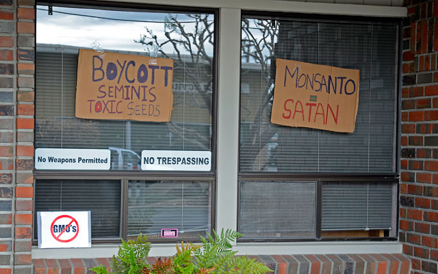 The Seminis office was empty on the day of the zombie demonstration, and the company's sign was removed from the front display, but a cap with Monsanto printed on it was visible in the office, as was a packet of Seminis seeds. A woman who worked for the building's management company told demonstrators that the office was, "rarely occupied, " and another tenant in the complex confirmed that commercial activity by Seminis was rarely seen.