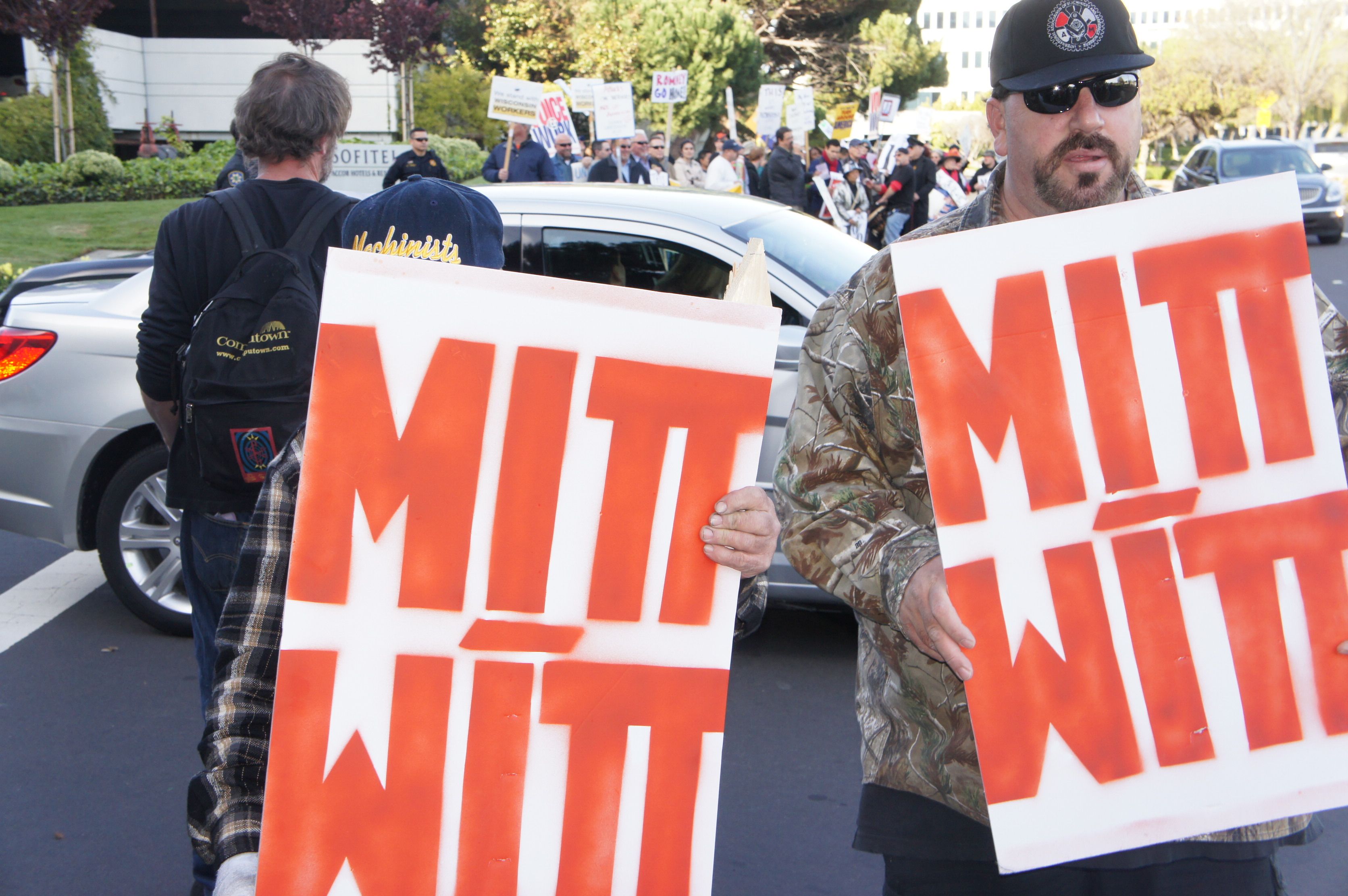 Protest at a Mitt Romney fundraising event caused a lot of commotion for people trying to gain entrance to the Sofitel Hotel in Redwood City, California on Monday. Some paid as much as $25,000 to attend, only to arrive at the hotel to find out the entrance was blocked by marching demonstrators; even activists from Occupy Oakland joined the rallying crowd. A giant Etch A Sketch with rotating messages was displayed in front of the hotel.