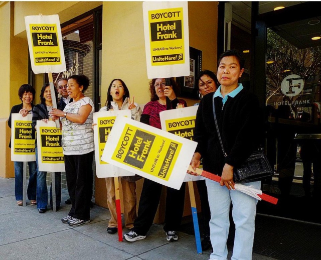 Workers at Hotel Frank have been under attack since Wells Fargo foreclosed on the hotel in May, 2010. Wells Fargo brought in a new management company, Provenance, which refuses to recognize the UNITE HERE Local 2 contract, has dangerously increased the workload for room cleaners and other workers, and did not pay one penny for medical coverage or pensions for almost two years.