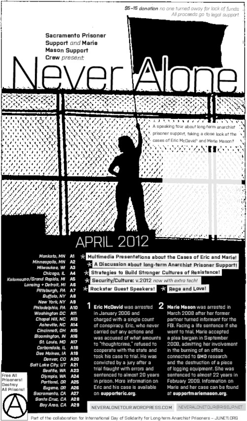 The nationwide Never Alone tour will be coming to your town in April 2012, featuring the usual suspects speaking about long-term anarchist prisoner support. Focusing specifically on the cases of Eric McDavid and Marie Mason, the tour will mark the spots where the events of these cases unfolded, using multimedia presentations to bring the facts of these cases to light.