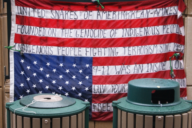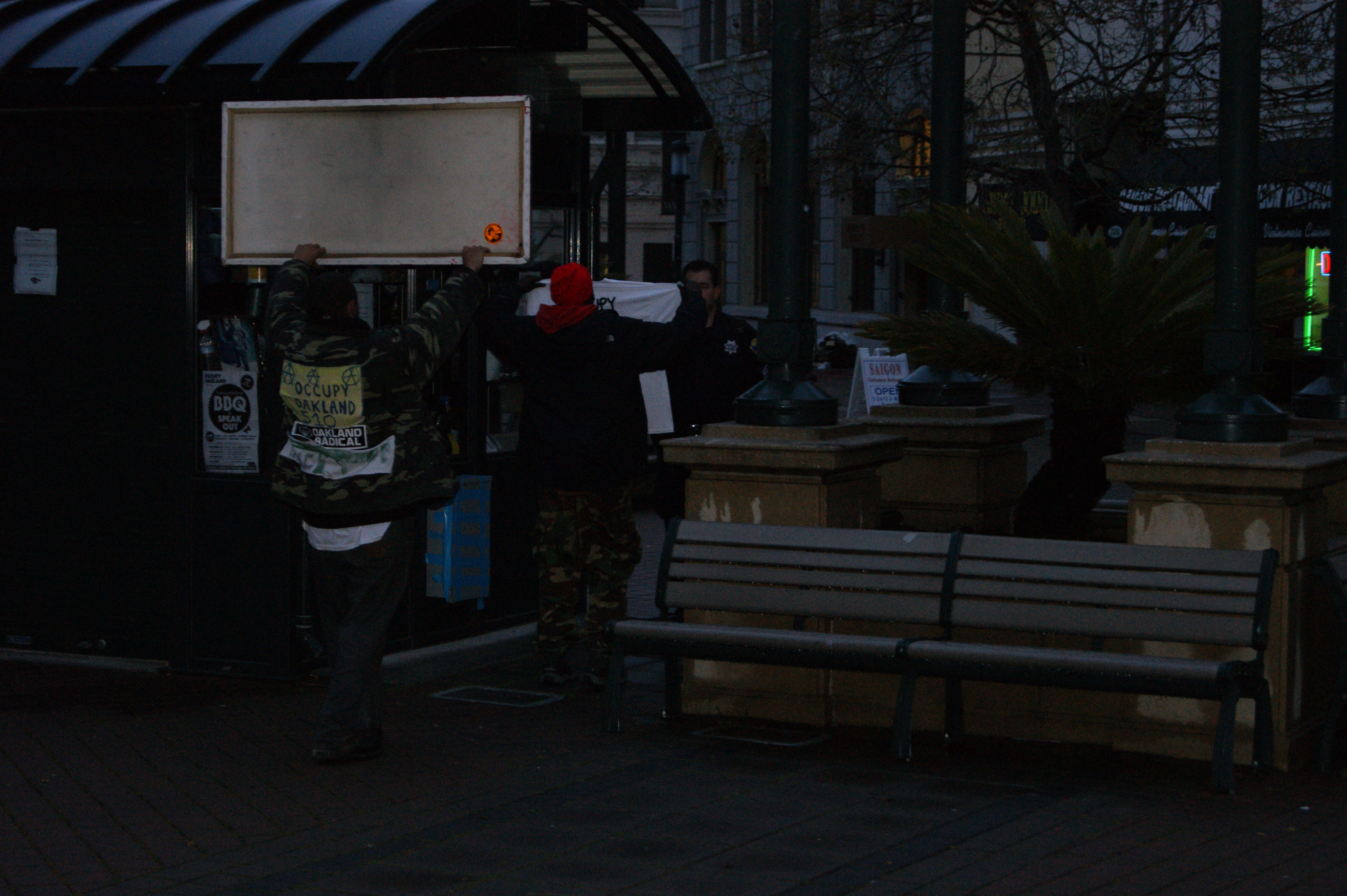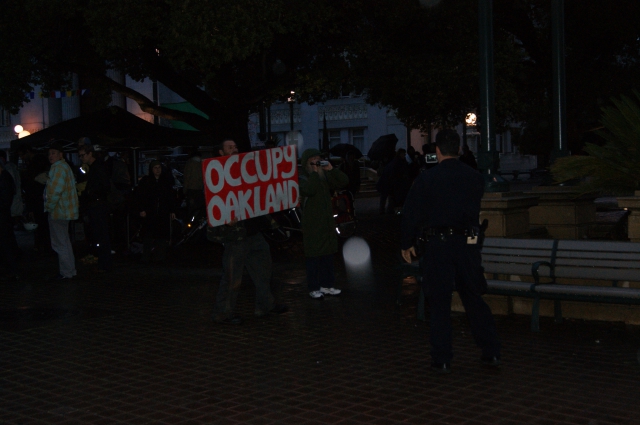 The cops started out with several attendees from their department. Then two vans with cops in riot gear showed up, then two more vans... They wanted to party like it was WW3, they certainly came dressed like they did. I am not aware of any arrests, although someone's PA system was aggressively taken and confiscated. I think the cops were mad that they did not get any ice cream. It looked really scary when they blocked off the north and east sides of Oscar Grant Plaza, although honestly they didn't have the man power to surround anyone, and on the south side of OGP it was possible to negotiate tactical avoidance of police. Occupy Oaklanders prevented police from taking video footage with one of the large OO# canvases. See you at Saturday's Fuck the Police March at 19th and Telegraph at 9 pm, rain or shine people, let's show the police we really care!