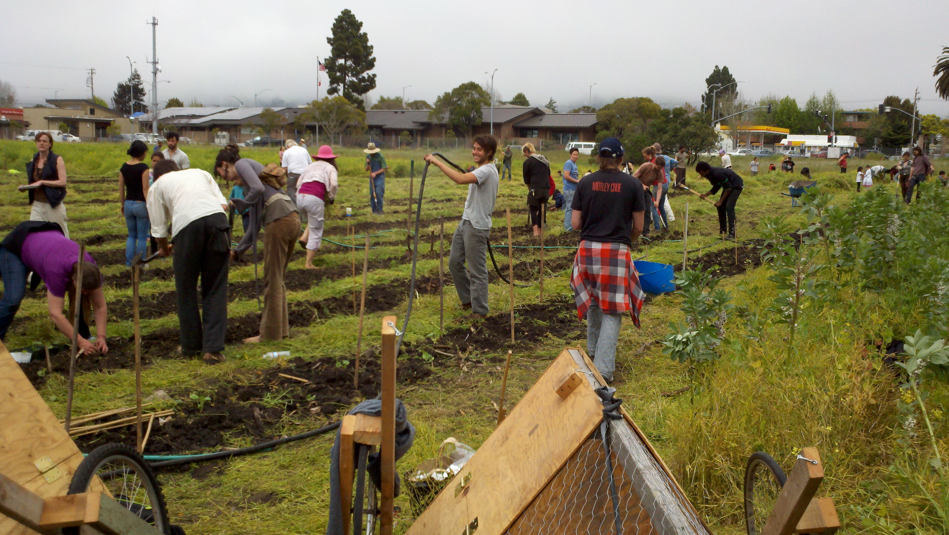 Two to three hundred people marched from the Earth Day rally at Ohlone Park in Berkeley to the Gill Tract at the intersection of San Pablo and Marin Avenues in Albany. This is the last best farmland in the East Bay, but the University of California intends to sell much of it to private developers so that a shopping center with a Whole Foods grocery store and a parking lot can be built. Immediately upon arrival, people began to clear and till the land. Organizers are asking supporters to tell friends, come down, and learn what urban farming is all about.