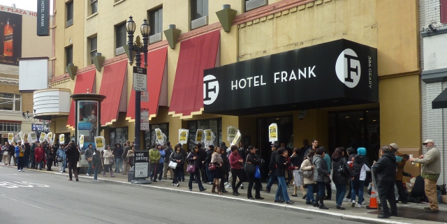 Workers at Hotel Frank have been under attack since Wells Fargo foreclosed on the hotel in May, 2010. Wells Fargo brought in a new management company, Provenance, which refuses to recognize the UNITE HERE Local 2 contract, has dangerously increased the workload for room cleaners and other workers, and did not pay one penny for medical coverage or pensions for almost two years.