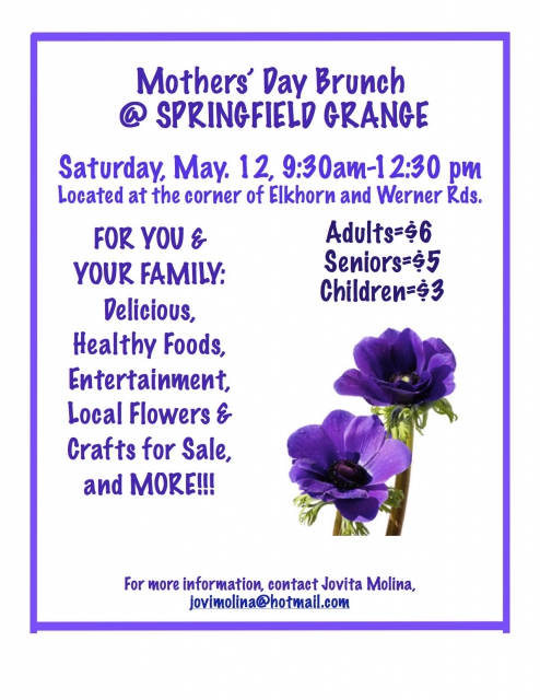 Día de las Madres, Almuerzo, @ LA GRANJA de SPRINGFIELD, Sábado, 12 de mayo, 9:30am-12:30 pm, Se ubica en la esquina de Elkhorn y Werner Rds. Ofrecemos a usted y su familia: Delicioso y saludable menú, Entretenimiento, Venta de flores y artesanías ¡Y más! Adultos=$6, Ancianos=$5, Niños=$3
