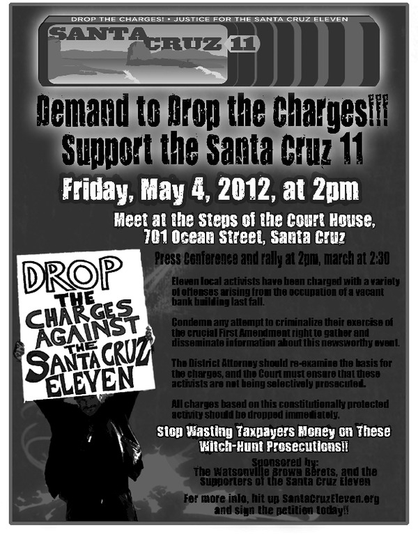 On Friday, May 4th, at 2:00 PM, at the Santa Cruz Courthouse, there will be a press conference, rally and march to demand DROPPING ALL CHARGES against the Santa Cruz Eleven. The Santa Cruz Eleven are local community members who have been charged with an unprecedented variety of offenses arising from their alleged involvement with the occupation of a long-time vacant bank building late last fall, 2011.