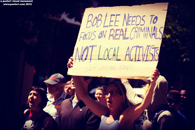 On May 4th, over a hundred people gathered at the Santa Cruz Courthouse for a press conference, march, and rally organized by the Watsonville Brown Berets to demand District Attorney Bob Lee drop the charges against the Santa Cruz Eleven — local community members who have been charged with an unprecedented variety of offenses arising from their alleged involvement with the occupation of a long-time vacant bank building at 75 River Street late last fall. The Santa Cruz Eleven are either journalists and/or activists supportive of the Occupy movement.