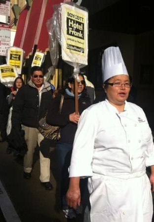 Workers at Hotel Frank have been under attack since Wells Fargo foreclosed on the hotel in May, 2010. Wells Fargo brought in a new management company, Provenance, which refuses to recognize the UNITE HERE Local 2 contract, has dangerously increased the workload for room cleaners and other workers, and did not pay one penny for medical coverage or pensions for almost two years.