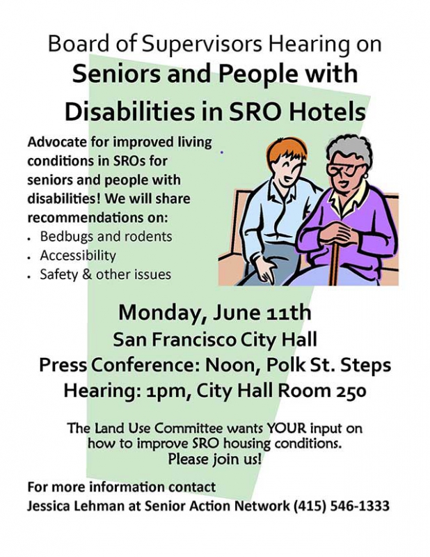 Are you a senior or person with a disability living in an SRO Hotel? Do you want to improve living conditions in your building? The Land Use Committee at City Hall needs your input on how to improve conditions in SRO Hotels. Please join tenants and community organizations at this important hearing.