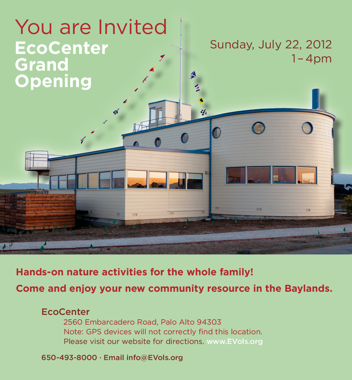 The EcoCenter Grand Opening will feature hands-on science activities, tours of the EcoCenter and its state-of-the-art touchscreen science exhibits, as well as bird watching, a scavenger hunt, a raffle, music, and free giveaways. Staff of the Environmental Volunteers will also lead groups around the Baylands Preserve on guided nature walks. Visitors can also download a free iPhone app self-guided tour of the Palo Alto Baylands Nature Preserve, available at http://www.EVols.org.