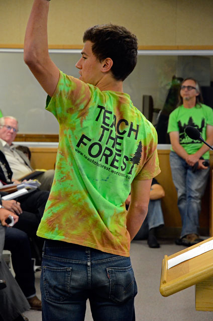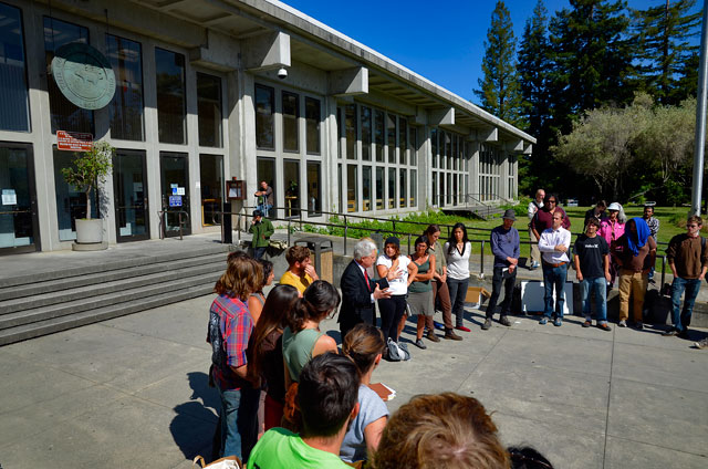 Before the meeting, community members gathered in front of the court house. The organization "Teach the Forest" distributed t-shirts, and people circled up and said a few words before entering the meeting as a group. A short presentation to LAFCO commissioners was first made by Chancellor Blumenthal, which was followed by a presentation on behalf of the City of Santa Cruz by council member Ryan Coonerty. Gary Patton spoke on behalf of the local organization the Community Water Coalition, which has opposed the university's water application on a variety of legal grounds. Of the more than 50 community members who spoke, only two were in favor of expansion into the upper campus, one of them being William Tysseling, the Executive Director of the Santa Cruz Chamber of Commerce.