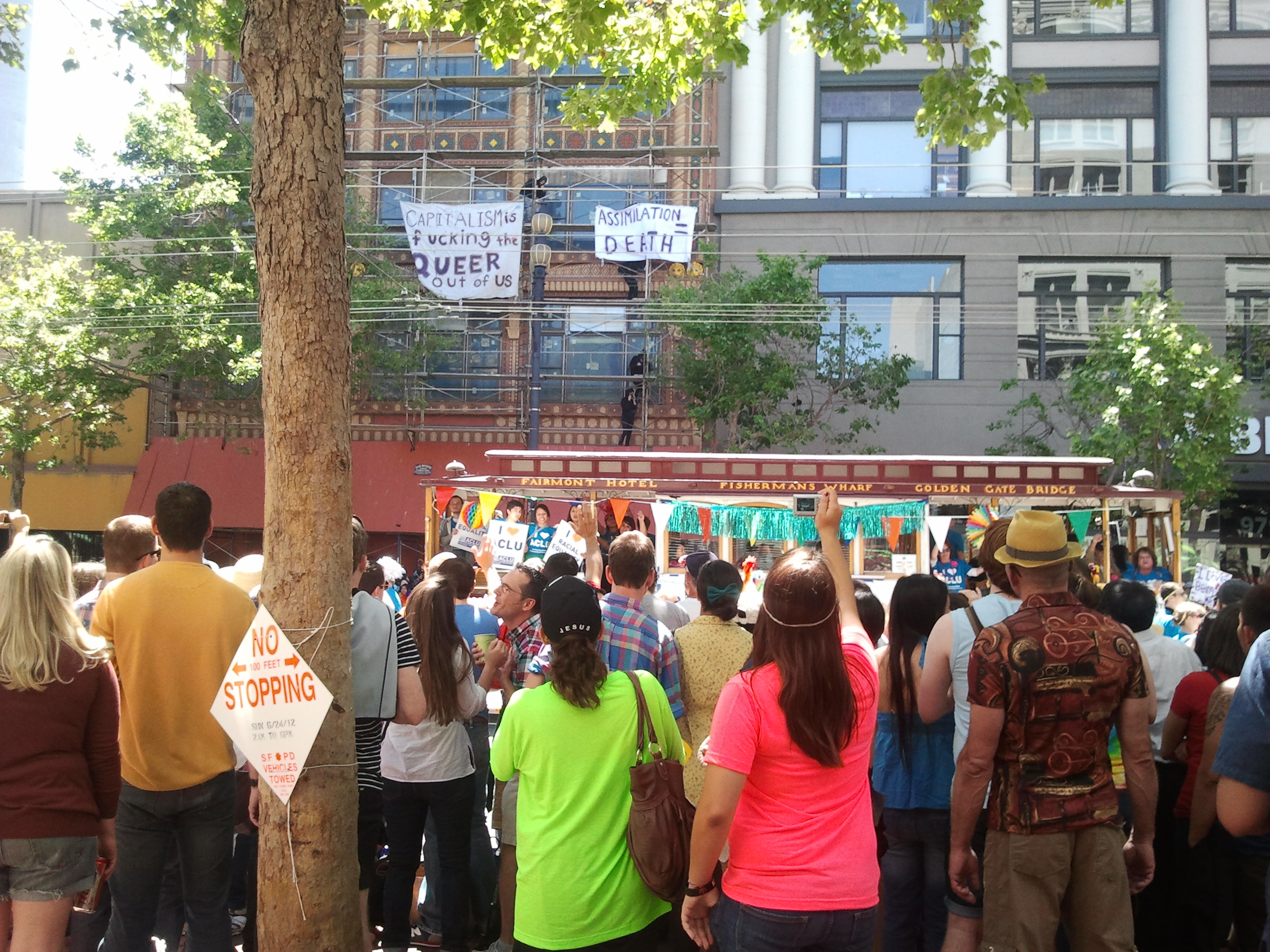 And once again some angry queer kids would have nothing to do with that and wanted to make some noise- or an appearence rather. They dropped two banners that said "Capitalism is Fucking the Queer out of US" and "Assimilation = Death" from a building in the heart of downtown while the massive parade glided by. The group was briefly detained by the police but no one got arrested, haha. When everyone came down the cops, shocked, asked " Why are there so many Women?" Fucking idiots. Later the angry queers shouted "were here were queer fuck the police" and "cops bash queers" at the SFPD as their gay cop brigade marched by.