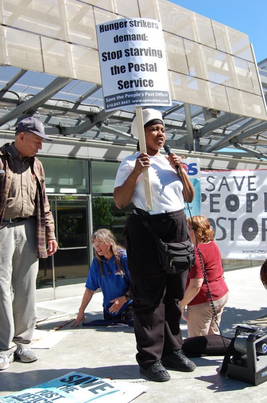 Wednesday, June 27, held a rally, march, and occupy of the Civic Center Post Office which serves many of the city’s homeless. We gathered in solidarity to support the national June 25-28 Hunger Strike by postal workers in Washington DC. This movement is growing across the country to stop threats of eliminating 220,000 living-wage jobs and closing 3,700 post offices including four in S.F. The majority of post offices threatened are in poor neighborhoods and rural areas.