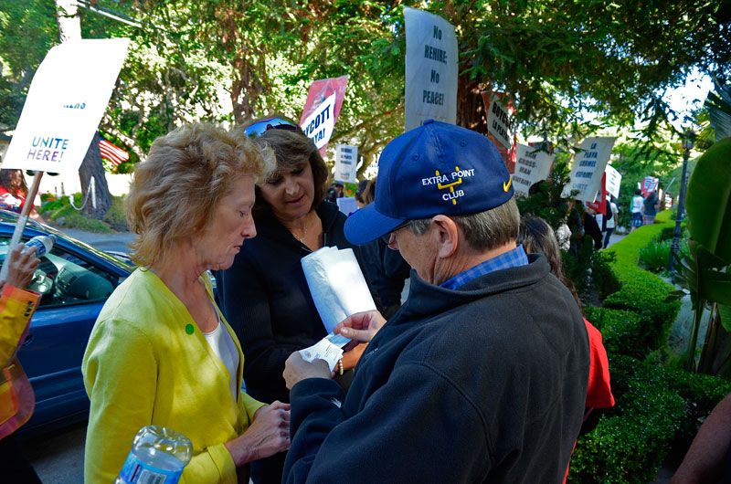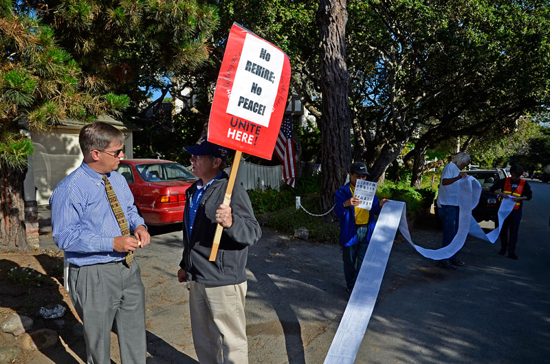 Approximately 150 community members and workers were joined by Monterey County Supervisor Jane Parker, Seaside Mayor Felix Bachofner, and State Assembly Member Bill Monning. Monning and Parker also wound up serving as go-betweens between community members and hotel management when another attempt was made to deliver the scroll of petitions filled with over 1000 signatures of Monterey area residents asking that the La Playa workers be rehired. The management of the hotel would not accept the petitions, so organizers of the demonstration unrolled the scroll, which stretched across both sides of the street directly in front of La Playa's lobby during the rally.