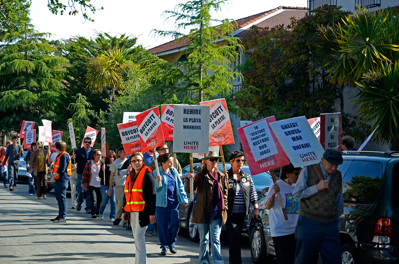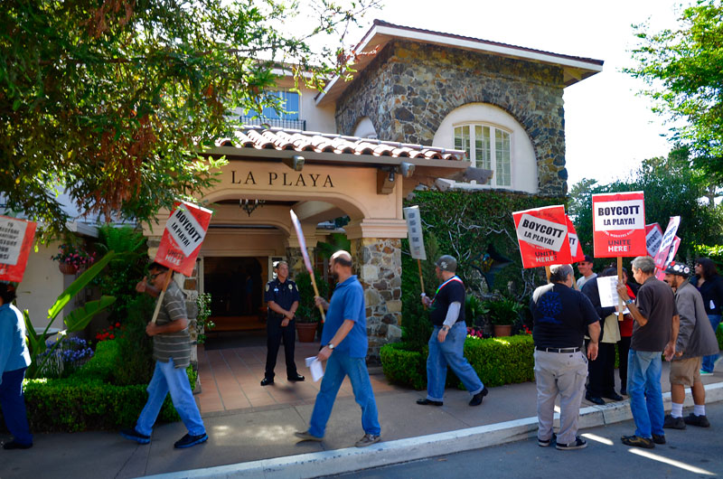 La Playa workers have been fighting for a new union contract since their's expired with the previous owner in August of 2010, and since the sale of the hotel to Sam Grossman in November of 2011, former workers have formed La Playa Hotel Workers for Justice, and they continue to fight to get their jobs back.
