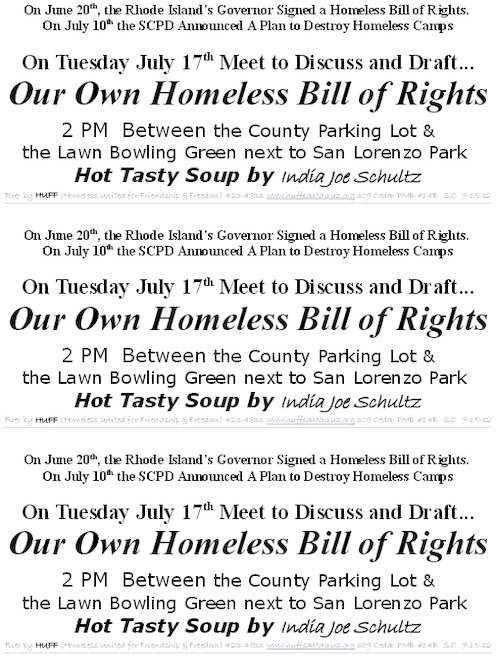 HUFF (Homeless United for Friendship & Freedom) will be serving some hot soup and taking accounts of what homeless people themselves would like to see in the Homeless Bill of Rights, particularly as regarding Santa Cruz.