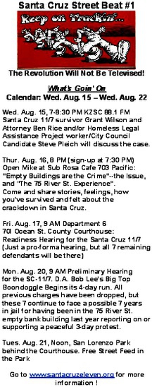 Wed. Aug. 15, 7-8:30 PM KZSC 88.1 FM Santa Cruz Eleven survivor Grant Wilson and Attorney Ben Rice and/or Homeless Legal Assistance Project worker/City Council Candidate Steve Pleich will discuss the case.