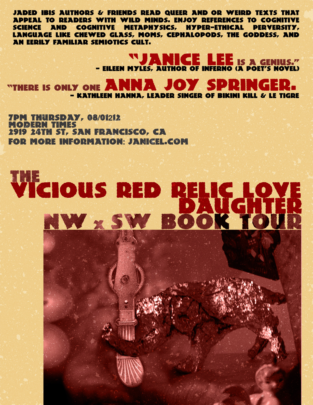 Anna Joy Springer is a former bandmember of Blatz, The Gr'ups, and Cypher in the Snow. She is an Associate Professor at UC San Diego where she teaches experimental writing, and her own books are called The Birdwisher and The Vicious Red Relic, Love.