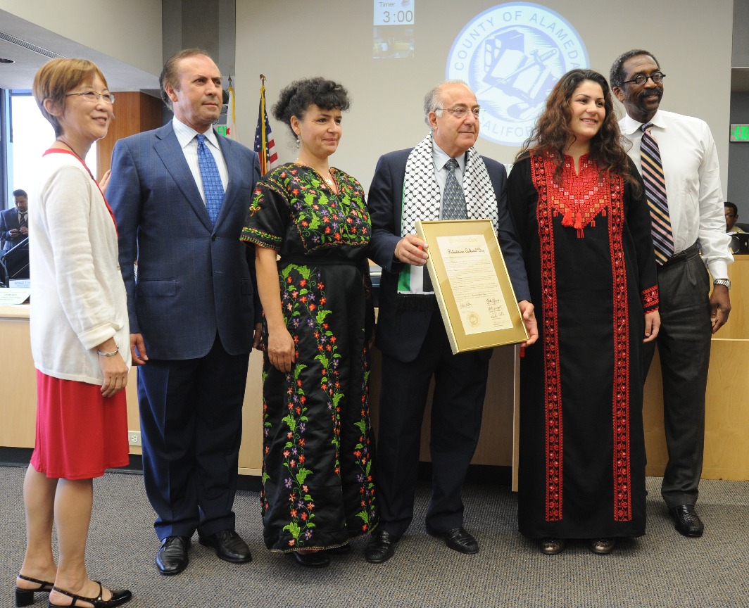 Alameda County became the second California county to recognize Palestinian residents as a people, having a rich culture, and contributing to the community. An earlier attempt by opponents to scuttle the proclamation in June was overcome by negotiations between residents and county supervisors. Supervisors Nate Miley and Wilma Chan presented the proclamation on behalf of the entire Board on July 24, 2012.