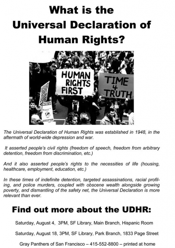 In these times of indefinite detention, targeted assassinations, racial profil-ing, and police murders, coupled with obscene wealth alongside growing poverty, and dismantling of the safety net, the Universal Declaration is more relevant than ever.