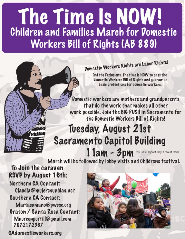 It's crunch time for the CA Domestic Workers Bill of Rights. We can't do this without you. Domestic Workers are mothers, aunties, and grandparents that do the work that makes all other work possible. It's time they get the basic rights that other workers already enjoy! On August 21st, children, families, workers, employers and allies will rally in Sacramento for a statewide event “The Time is Now!” calling on legislators to pass the CA Domestic Workers Bill of Rights (AB 889).