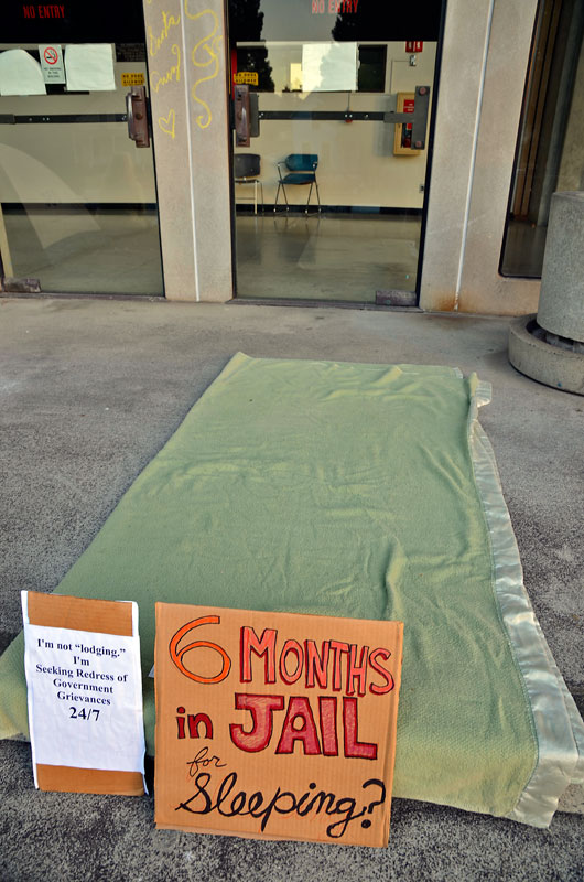 Sheriff's deputies woke Ed Frey from sleep on the steps of the Santa Cruz court house on August 7, 2010, when Frey was protesting the City of Santa Cruz sleeping ban as part of the Peacecamp protests. They wound up arresting him for "Illegal Lodging" under California penal code 647 (e), a statute with ties to 19th century slavery laws in the state. Eventually, Fry was sentenced to six months in jail for sleeping that night, and after a denied appeal attempt, in a Santa Cruz court he was forced to report to jail on August 8 by visiting Monterey County Judge Robert Moody. Earlier this week Frey made arrangements to serve the time under work release/house arrest. and he will be able to continue his work as an attorney.