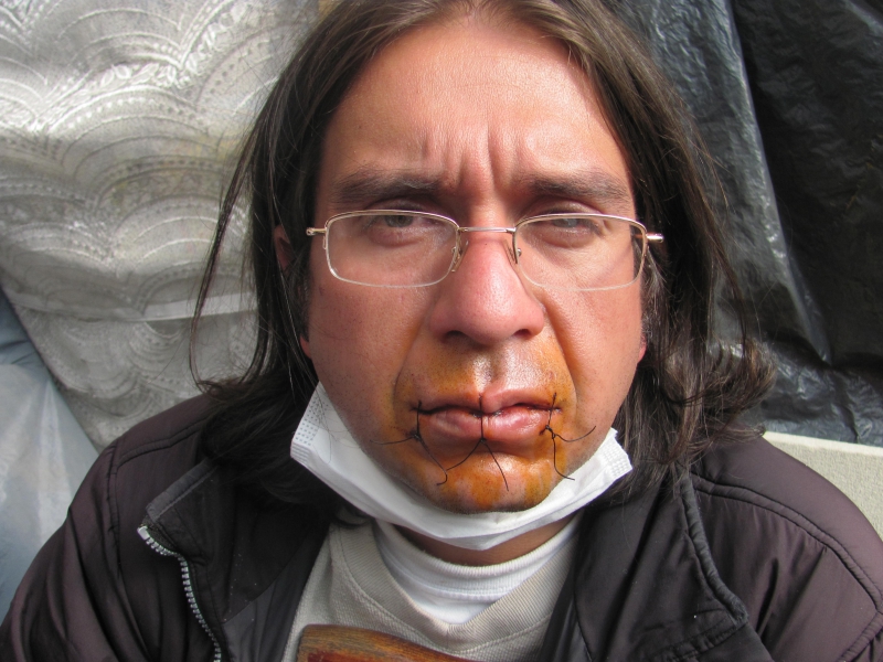 Injured workers from the General Motors Colmotores assembly plant in Bogota, Colombia, after a year occupying the sidewalk in front of the U.S. Embassy, sew their lips shut in hunger strike they are determined to carry out until General Motors Colmotores resolves their situation. They are prepared to give their lives so that workers do not continue to be exploited by multinational corporations in Colombia.