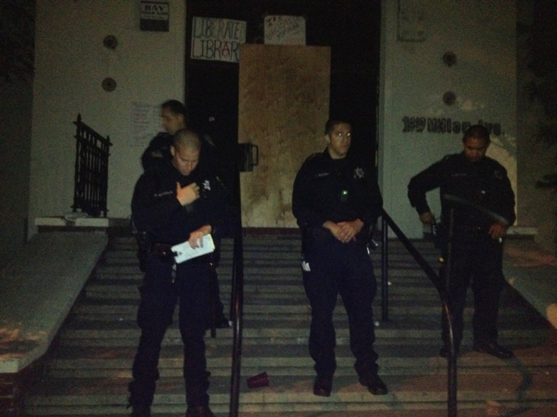 Just before midnight dozens of police officers blocked off side streets and raided the library. City workers are boarding the building up now. Fuckers! City officials must love blight and a lack of public resources. Oakland's priorities are upside down when out of town police suck away over 40% of Oakland's budget every year and a community library operated by volunteers at no cost to city taxpayers is not allowed to exist.